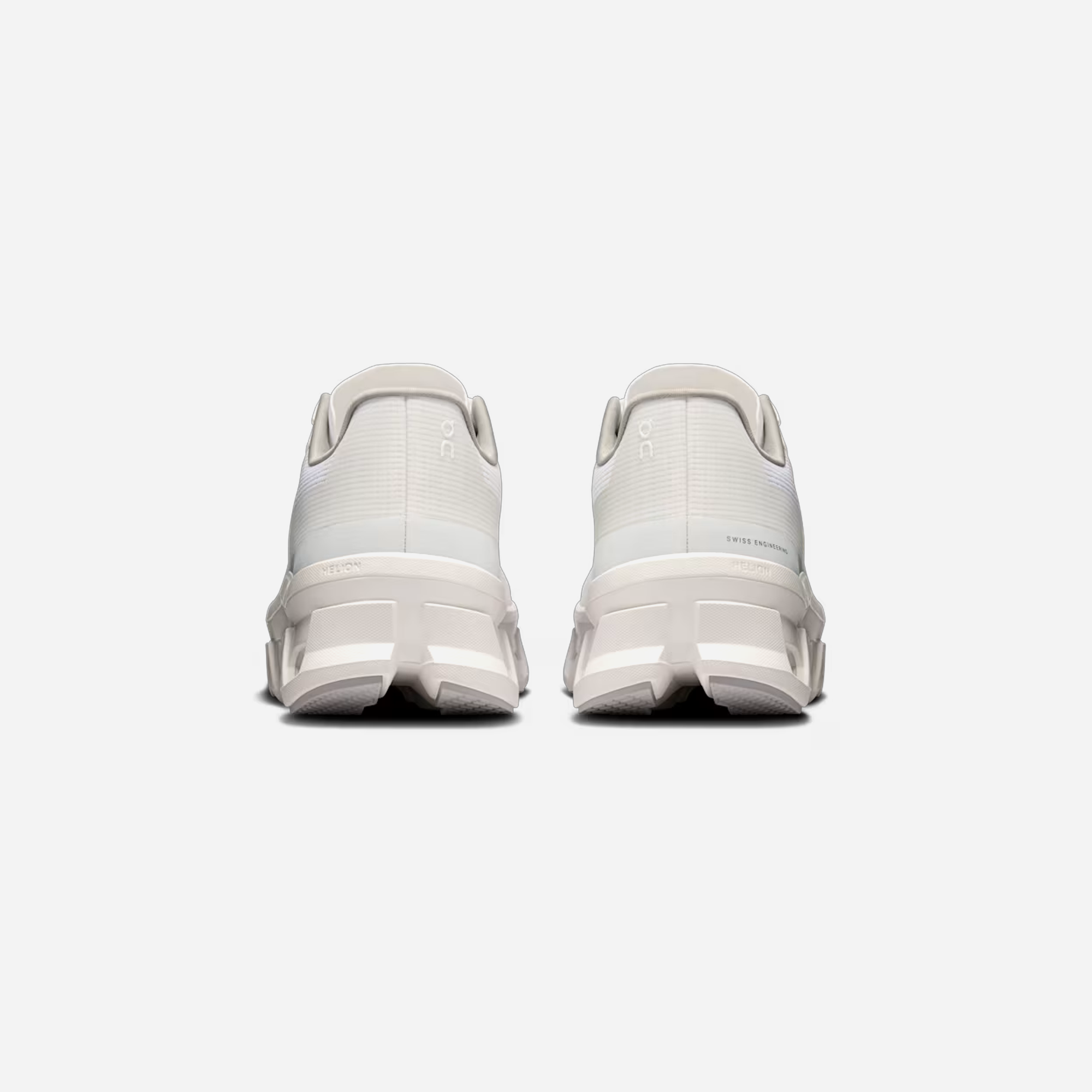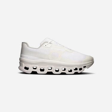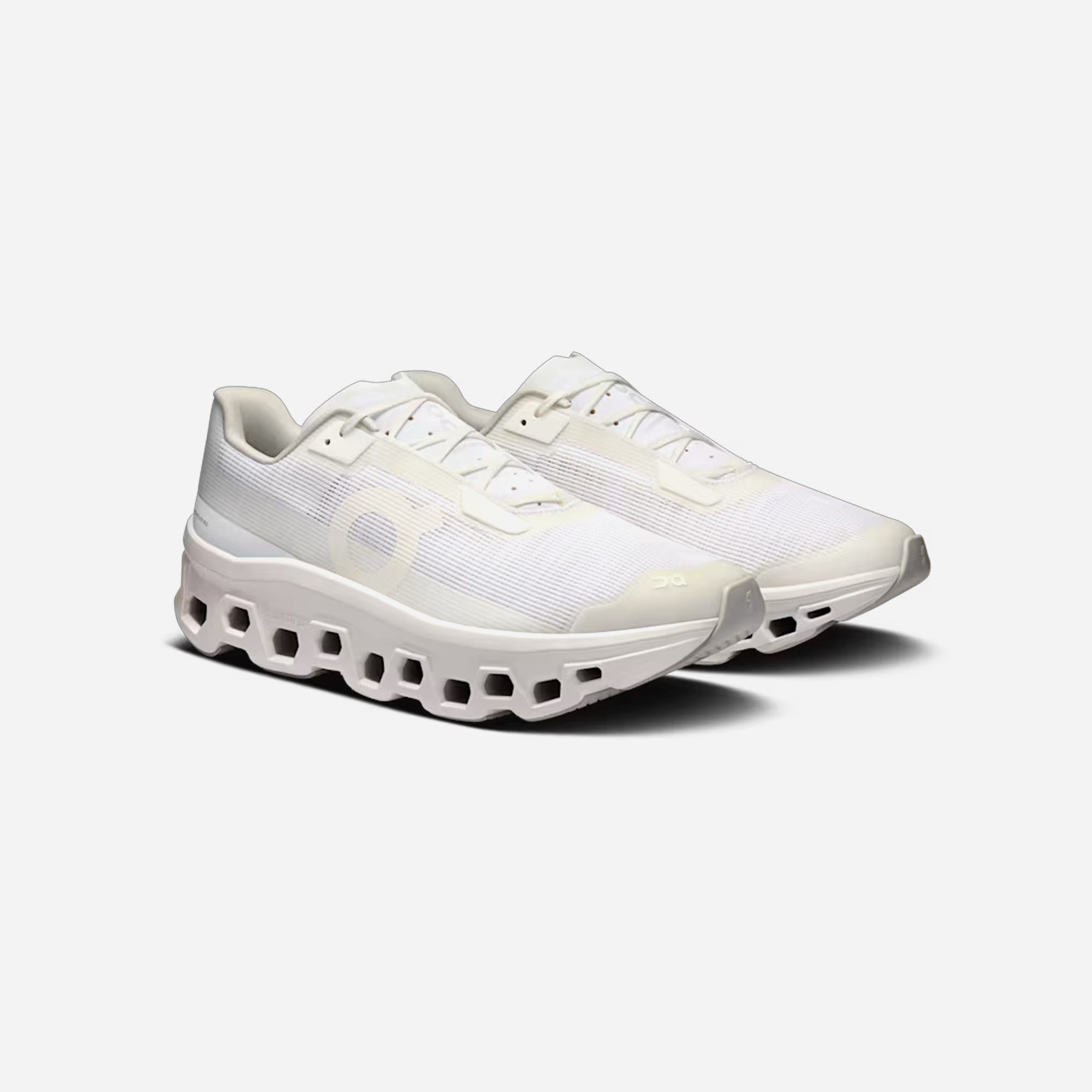 ON Running Cloudmonster Void White White combines innovative cushioning with clean aesthetic design for modern runners. The CloudTec sole technology ensures responsive comfort and efficient energy return on every run. These lightweight performance shoes provide excellent stability and support for both training and racing applications.