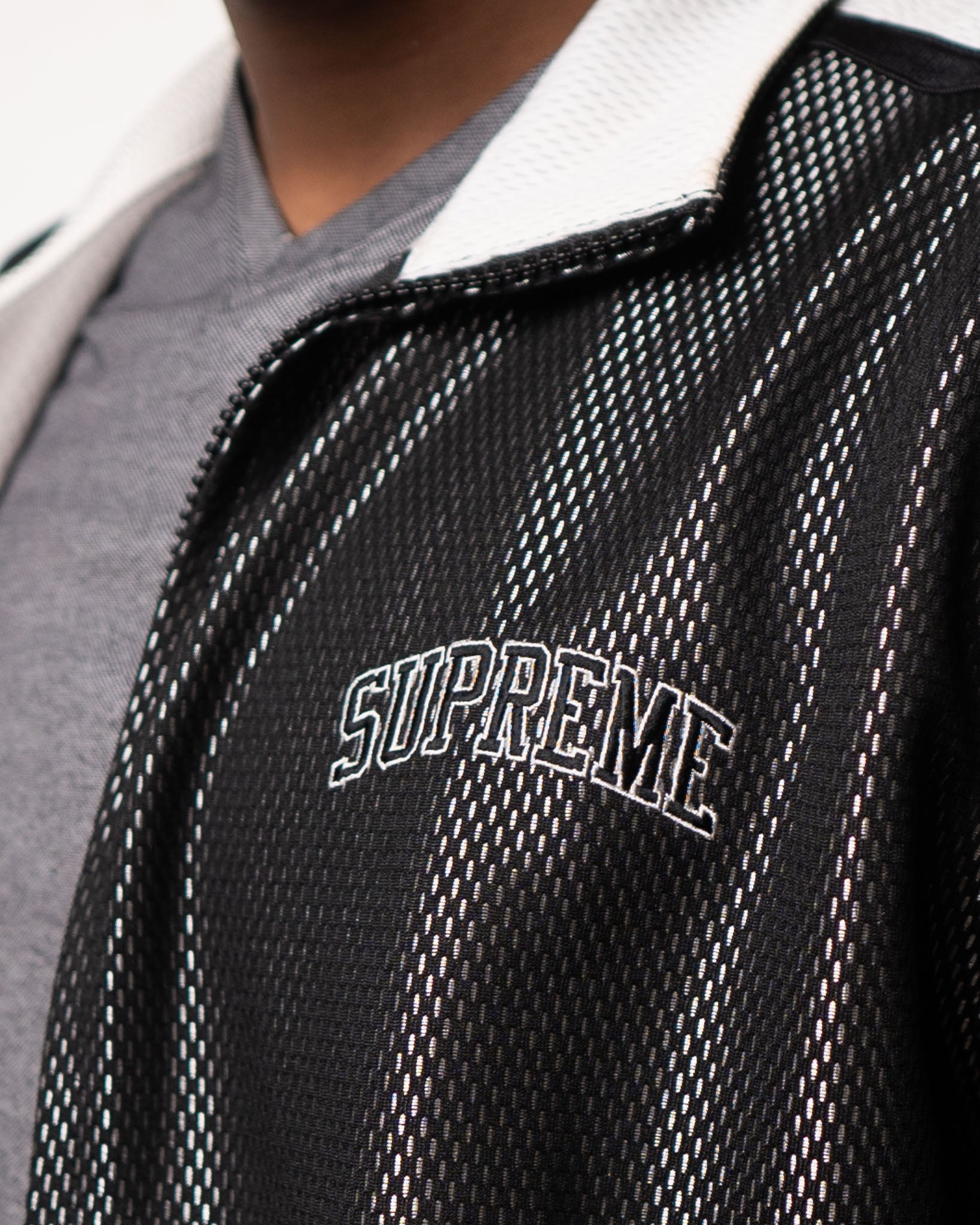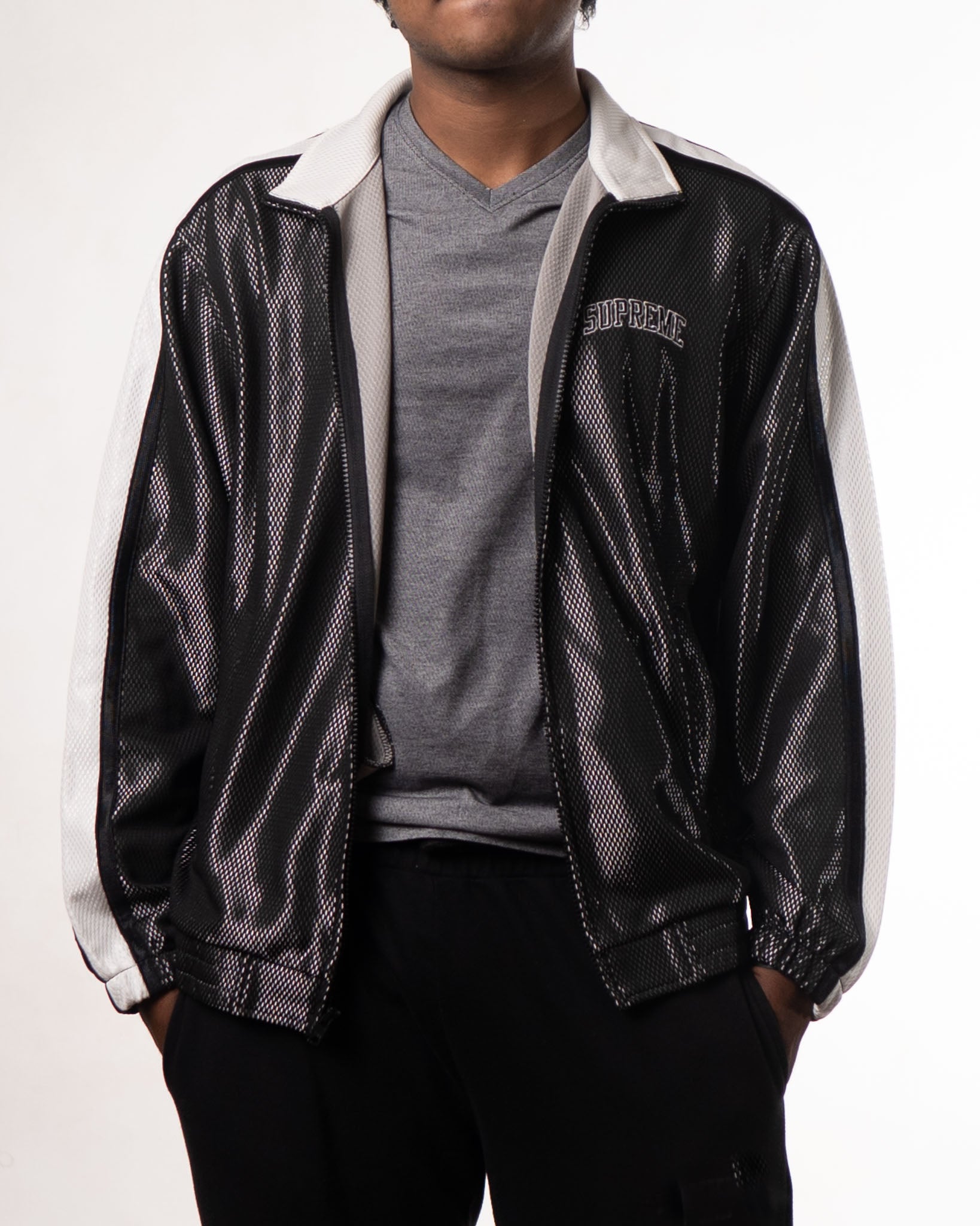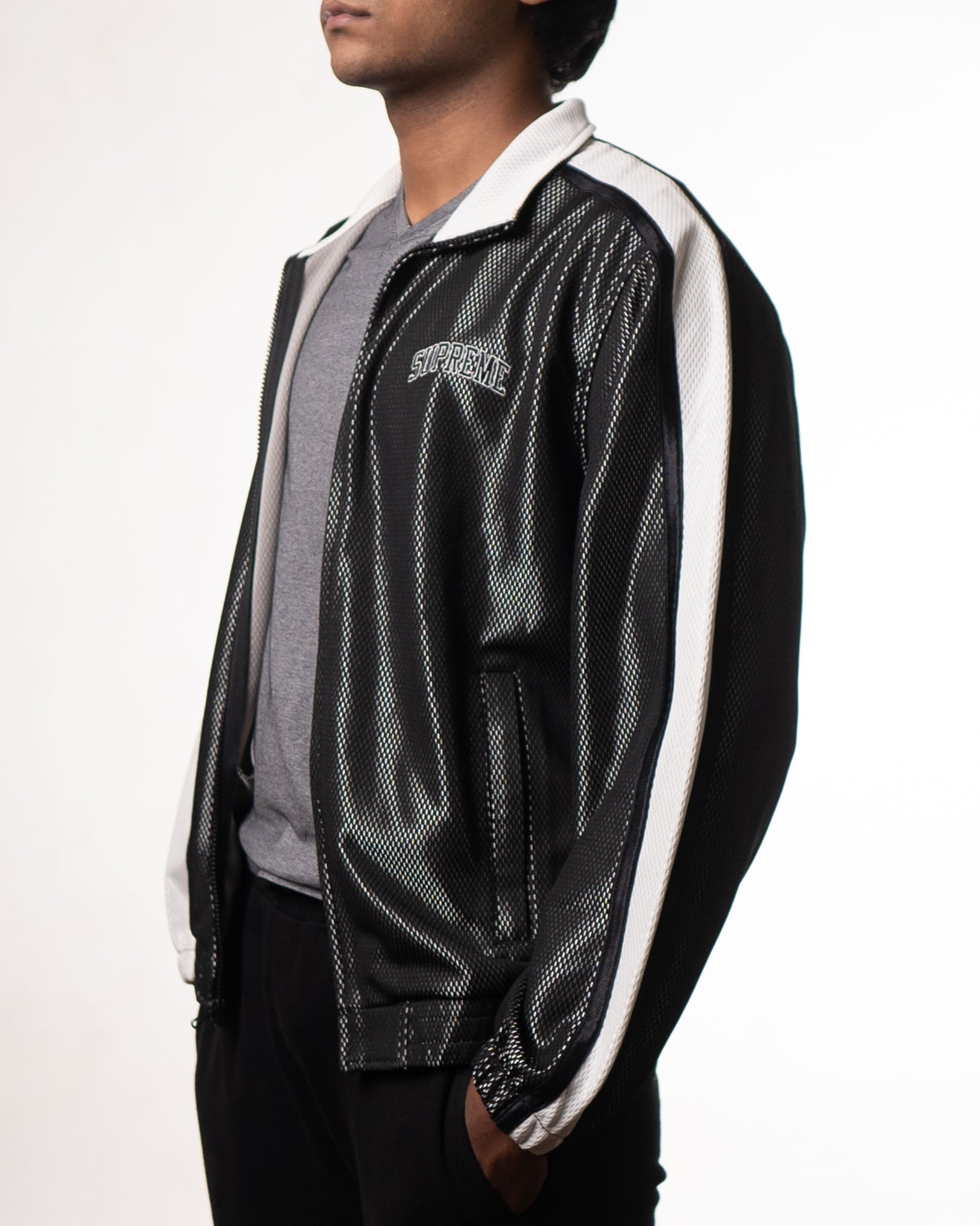 Supreme Black Bounded Mesh Track Jacket in size M combines technical sportswear aesthetics with streetwear credibility, featuring premium mesh construction for contemporary edge. Dark