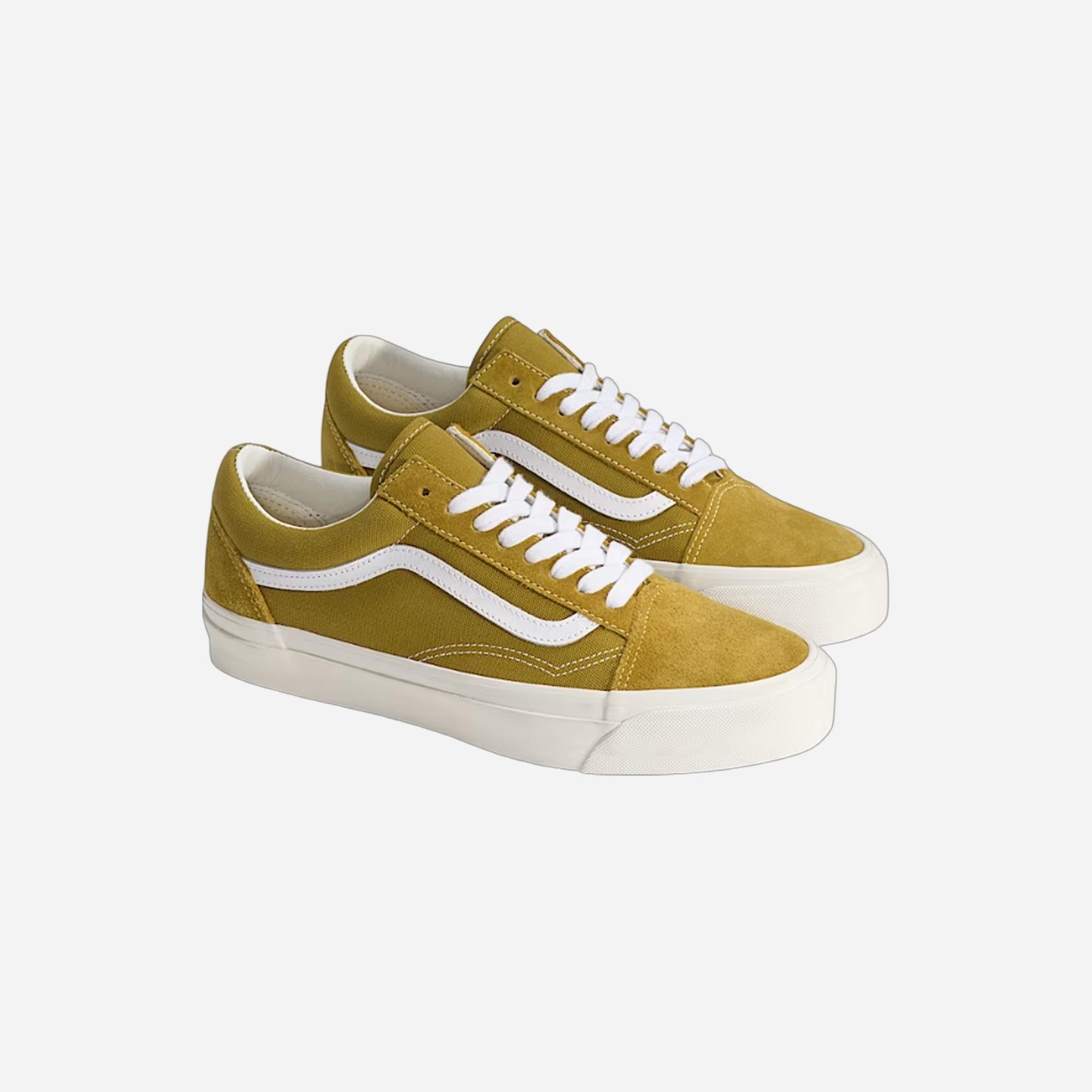 The Vans Premium Old Skool Burnt Gold Yellow shoes elevate classic skate style with a vibrant colorway. These iconic low-top sneakers feature durable canvas and suede uppers, offering maximum comfort and long-lasting wear. Enjoy exceptional grip and signature support with the sturdy rubber waffle outsole. Perfect footwear for daily casual wear.