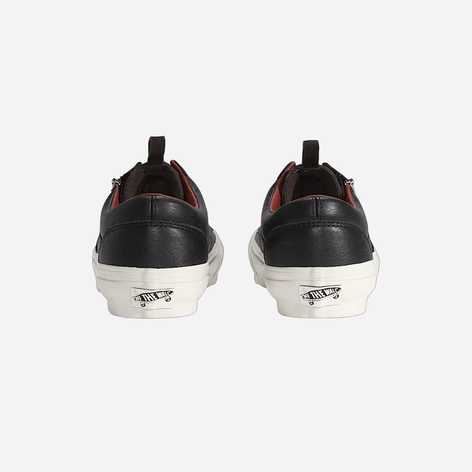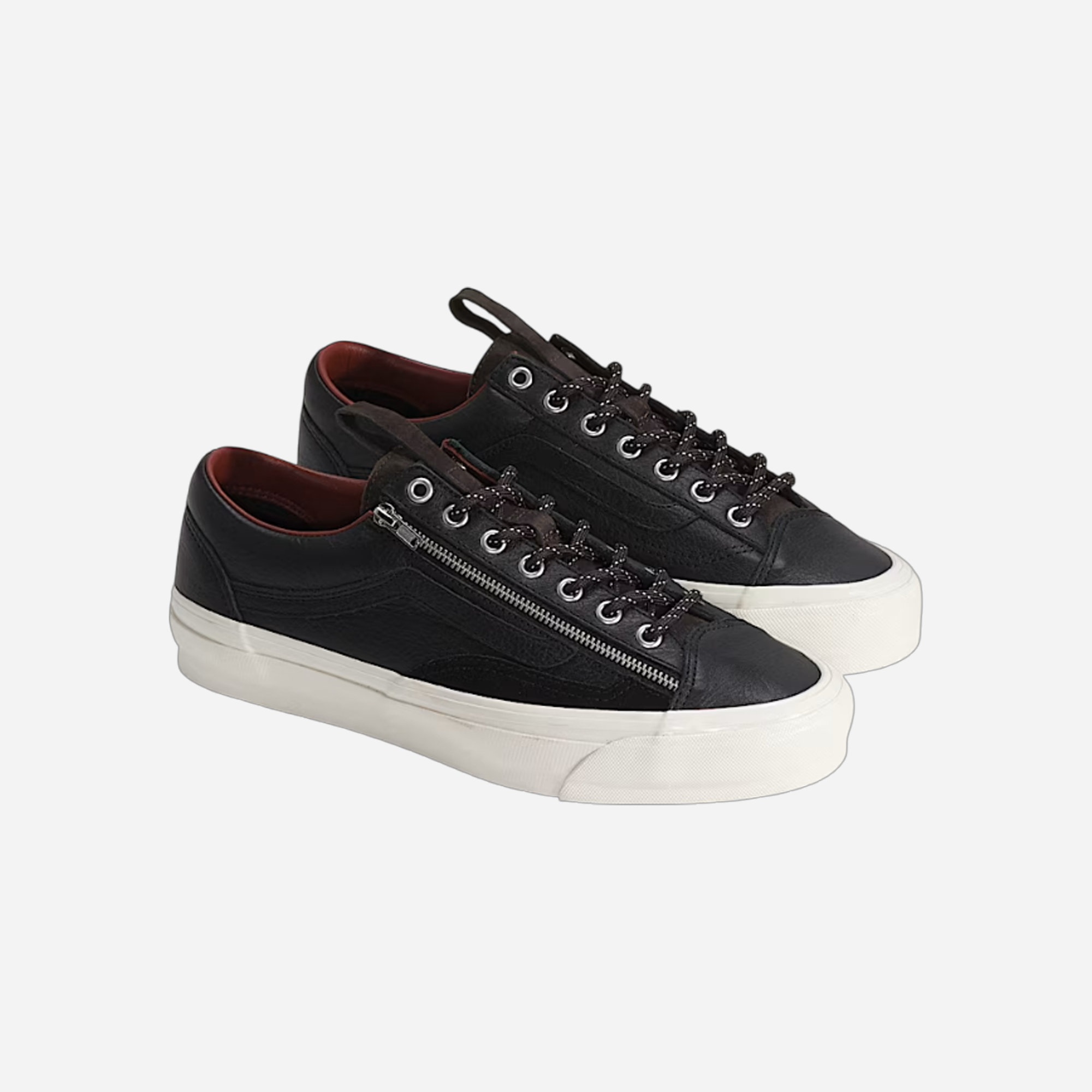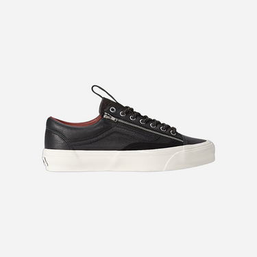 The Vans Premium Old Skool Zip Black sneakers redefine classic skate style with a functional zipper detail for easy entry. These durable low top shoes feature a premium black canvas and suede upper providing excellent comfort and board feel. They include the iconic rubber waffle outsole offering superior grip making them essential footwear for everyday wear.