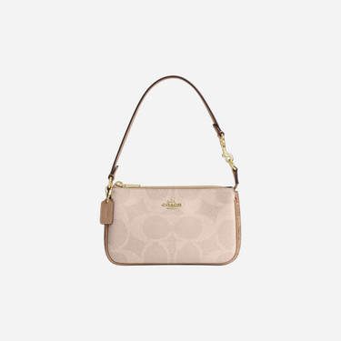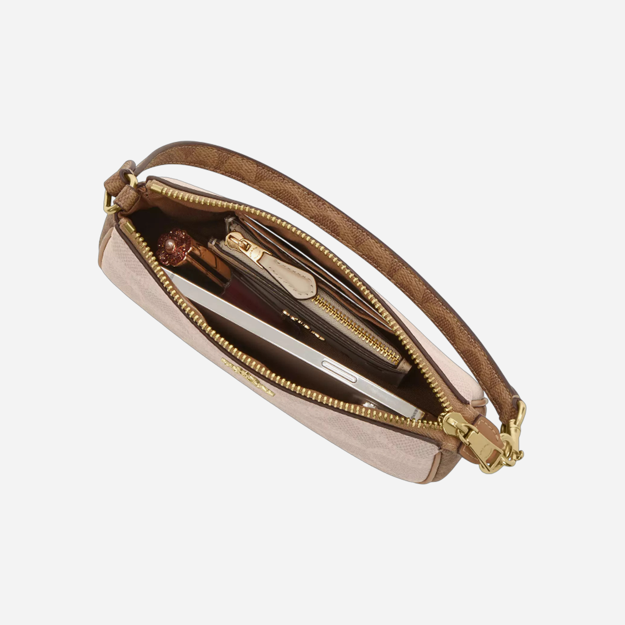 COACH Nolita 19 In Blocked Signature Canvas Gold Sand Tan is a sophisticated handbag featuring iconic blocked signature canvas in warm gold sand and tan tones. Perfect for everyday elegance, this timeless piece combines luxury craftsmanship with versatile style for the modern professional woman.