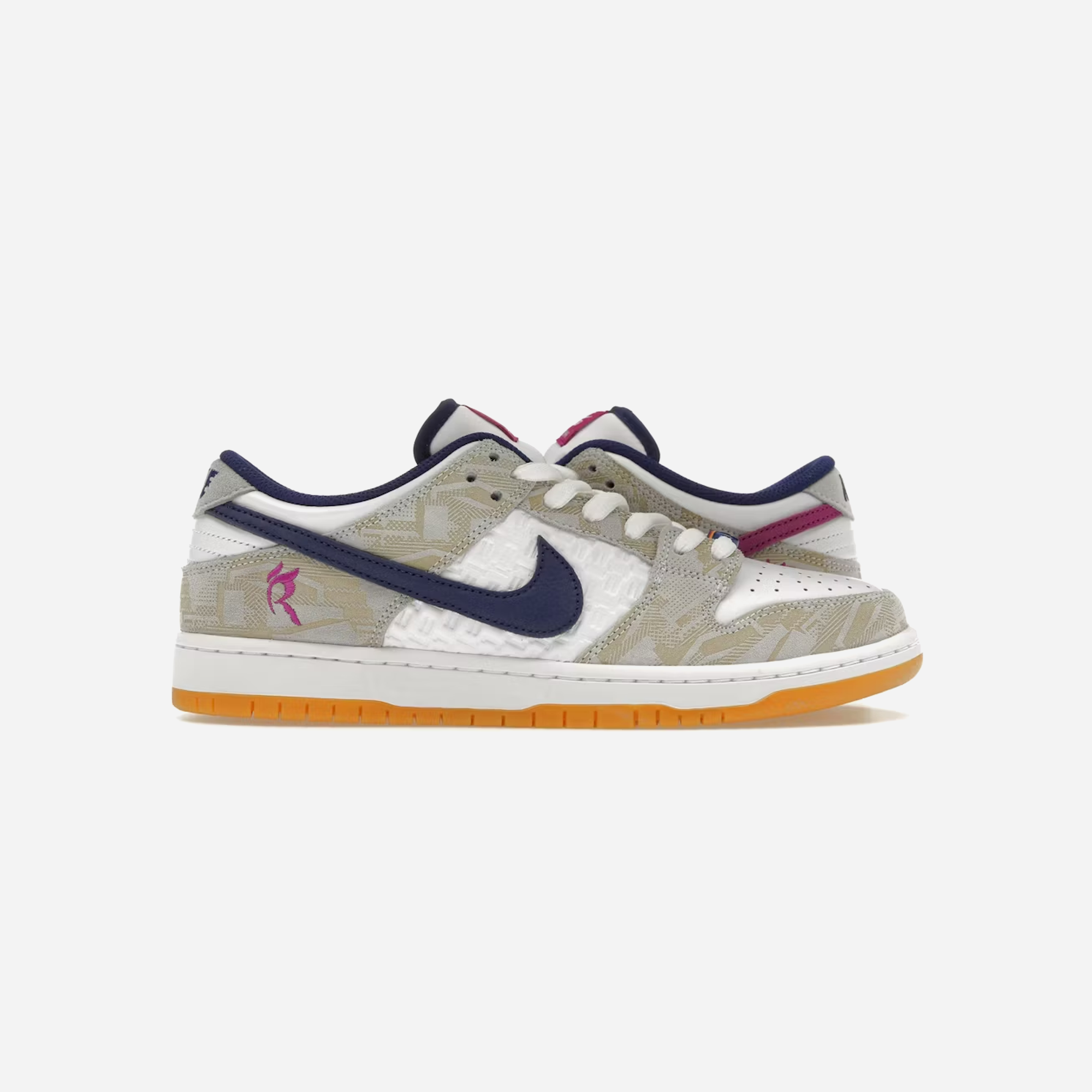 The Rayssa Leal x Nike Dunk Low SB debuts a special-edition colorway designed in collaboration with the Brazilian skateboarder. Mismatched blue and fuchsia Swooshes adorn the upper, featuring a white leather base with patterned grey suede overlays. Rayssa's personal logo decorates the lateral heel, while a trio of multicolored lace charms display digital smiley faces. The same graphic is embossed in a repeating pattern throughout each quarter panel. Underfoot, a gum rubber outsole provides grippy traction.