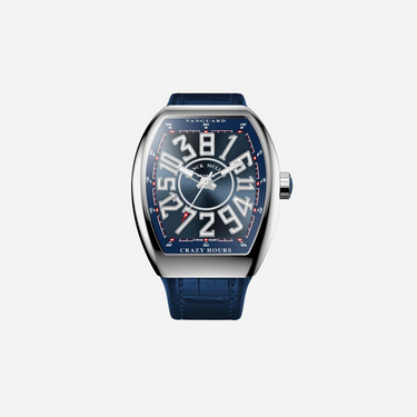 The Franck Muller Vanguard Crazy Hours watch features a distinctive blue dial and a high-quality leather strap. This luxury timepiece showcases the unique jumping hour complication, making it a conversation starter. Enjoy precision and unconventional style with this exceptional 45mm Franck Muller watch.