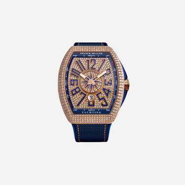 The Franck Muller Vanguard Diamonds Dial watch features a striking diamond-set dial and bold design. This 45mm timepiece is presented on a durable nylon fabric strap, merging luxury aesthetics with a sporty feel. It is a sophisticated Franck Muller watch for enthusiasts of fine timepieces.