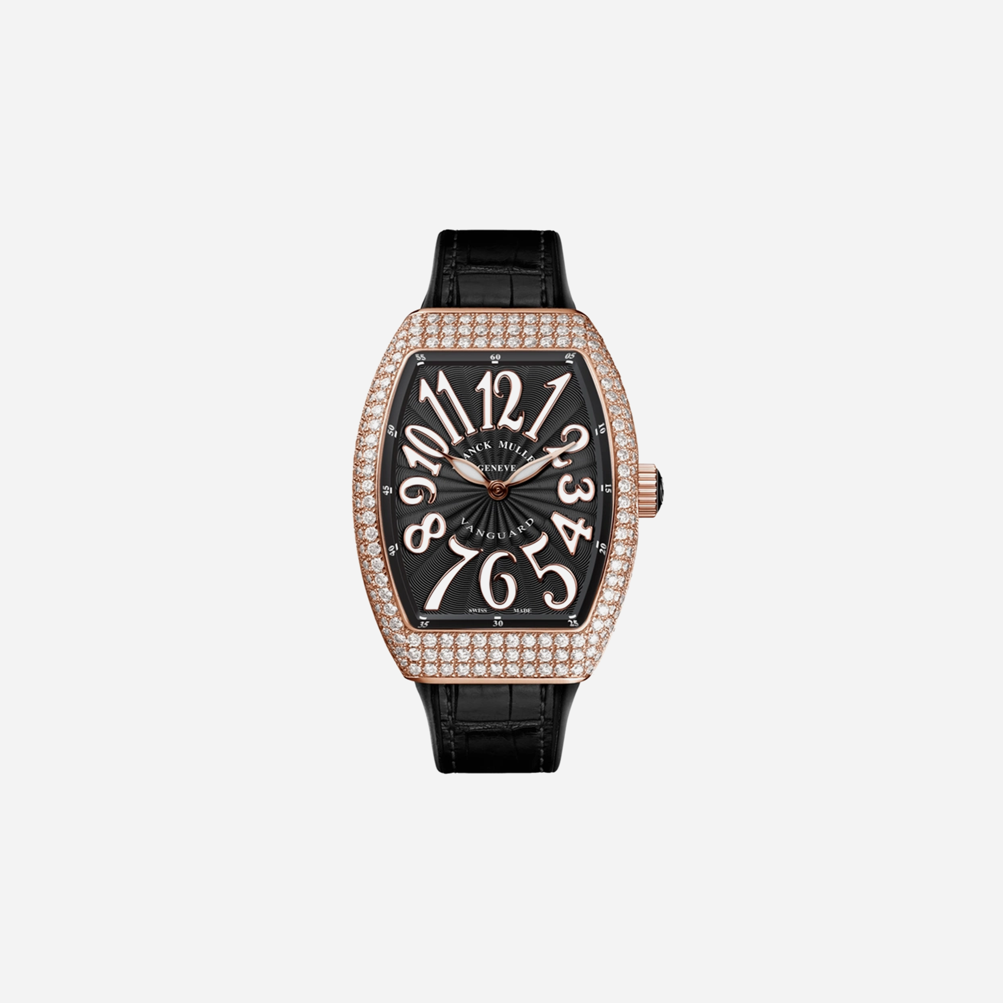 The Franck Muller Vanguard Lady Black Dial watch is an elegant timepiece featuring a striking black dial and a luxurious leather strap. This 32mm women's watch combines sophisticated design with timeless style. Perfect for everyday luxury, it adds a touch of glamour to any outfit.