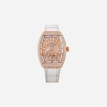 The Franck Muller Vanguard Lady watch is an exquisite timepiece featuring a stunning diamond-set dial. This luxurious womens watch combines elegant design with a comfortable leather strap, perfect for sophisticated everyday wear. Experience the prestige and craftsmanship of a genuine Franck Muller design.