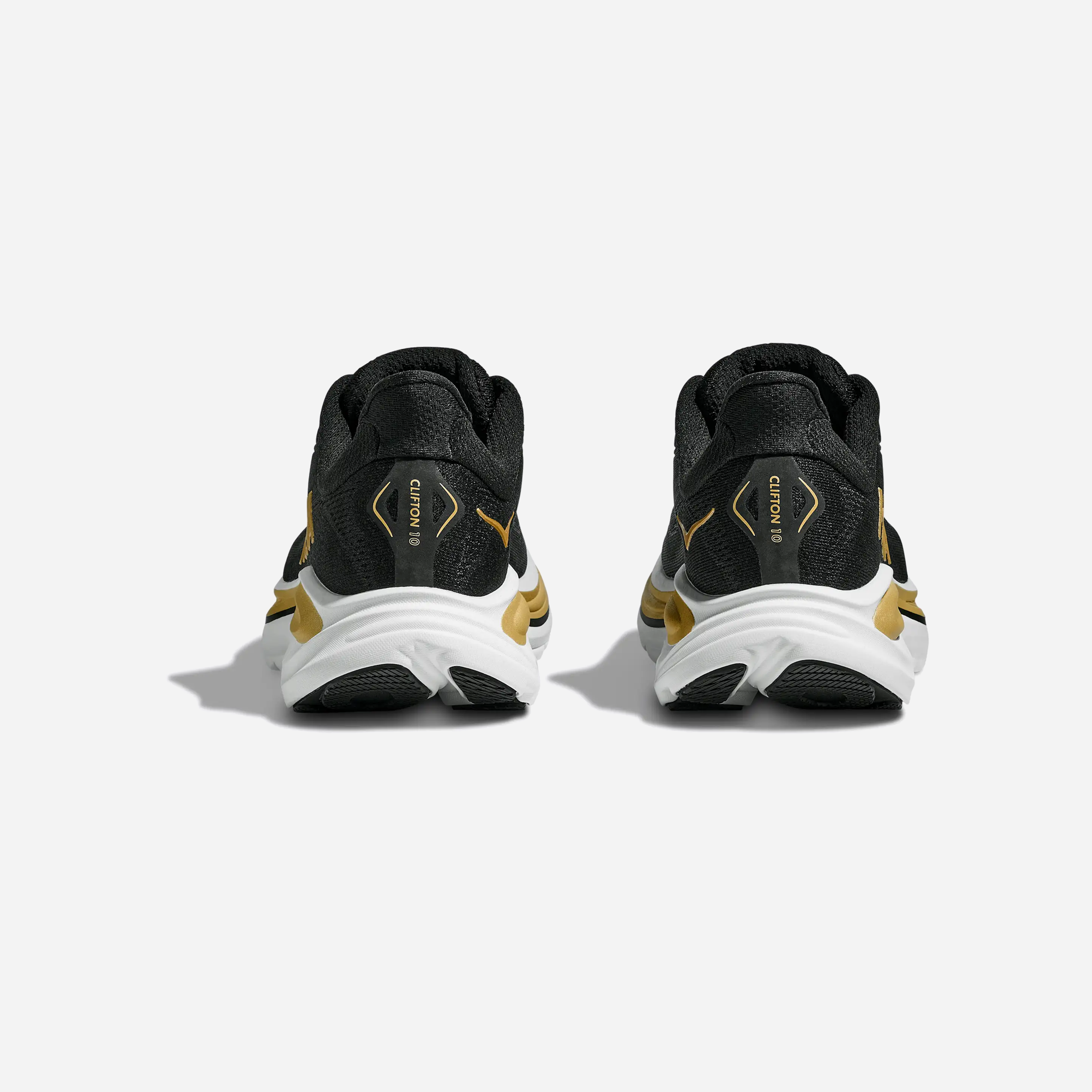 The Hoka Clifton 10 Black Gold Regular WMNS offers superior cushioning and a lightweight feel for women runners seeking daily comfort and performance. This sleek shoe features a breathable design and smooth ride perfect for long distance training. Experience the perfect blend of style and function with Hoka's renowned support.
