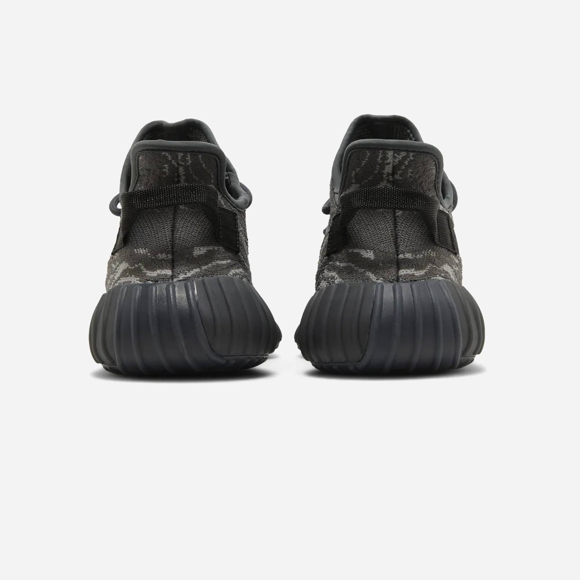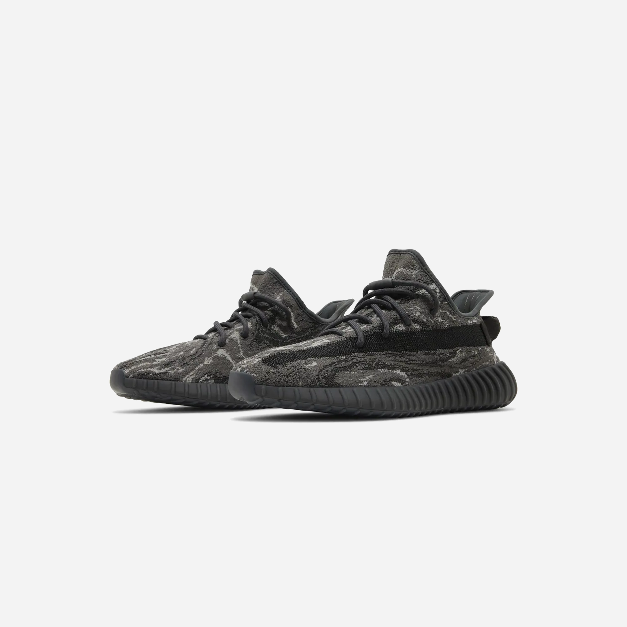 The Adidas Yeezy Boost 350 V2 MX Dark Salt features a marbled Primeknit upper blending shades of grey, black, and muted blue, creating a distinctive swirling pattern. A solid black side stripe and matching heel tab add contrast, while the translucent ribbed midsole houses responsive Boost cushioning for all-day comfort. This versatile design combines style and functionality, making it suitable for both casual wear and athletic activities.