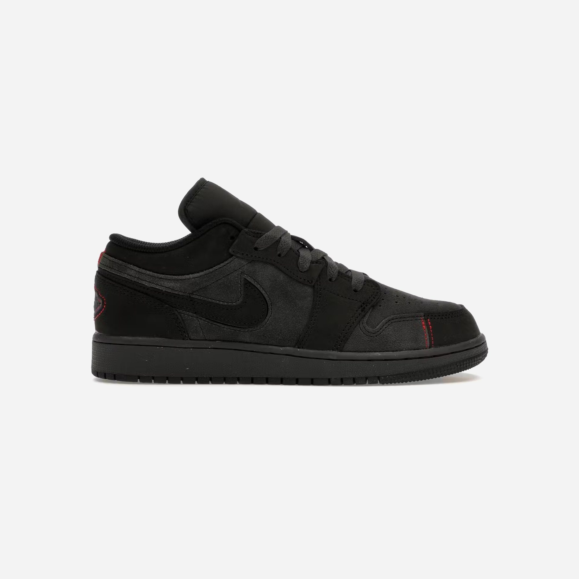 The Nike Air Jordan 1 Low SE Craft 'Dark Smoke Red' delivers complementary shades of black and dark grey on the leather and suede upper, featuring a breathable nylon tongue with embroidered Jumpman branding. Contrast red stitching traces the embossed Win logo that decorates the back heel. The low-top is mounted on a charcoal-hued rubber midsole with encapsulated Air-sole cushioning in the heel.