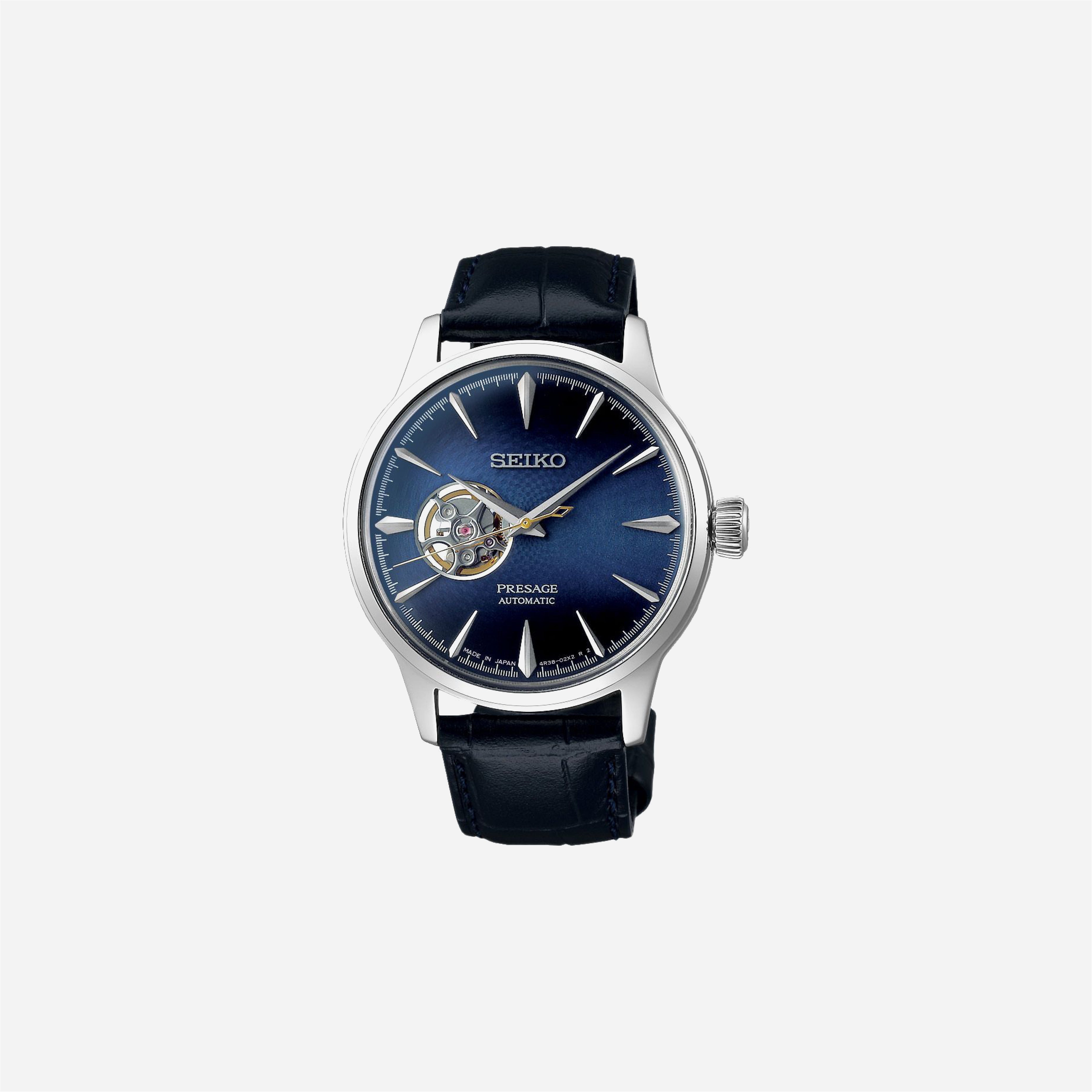 The Seiko Presage Automatic Watch showcases a beautiful blue dial and is paired with a comfortable leather strap. This timepiece features a reliable automatic movement, blending traditional watchmaking with modern elegance. It is the perfect choice for the discerning individual seeking sophistication and quality.