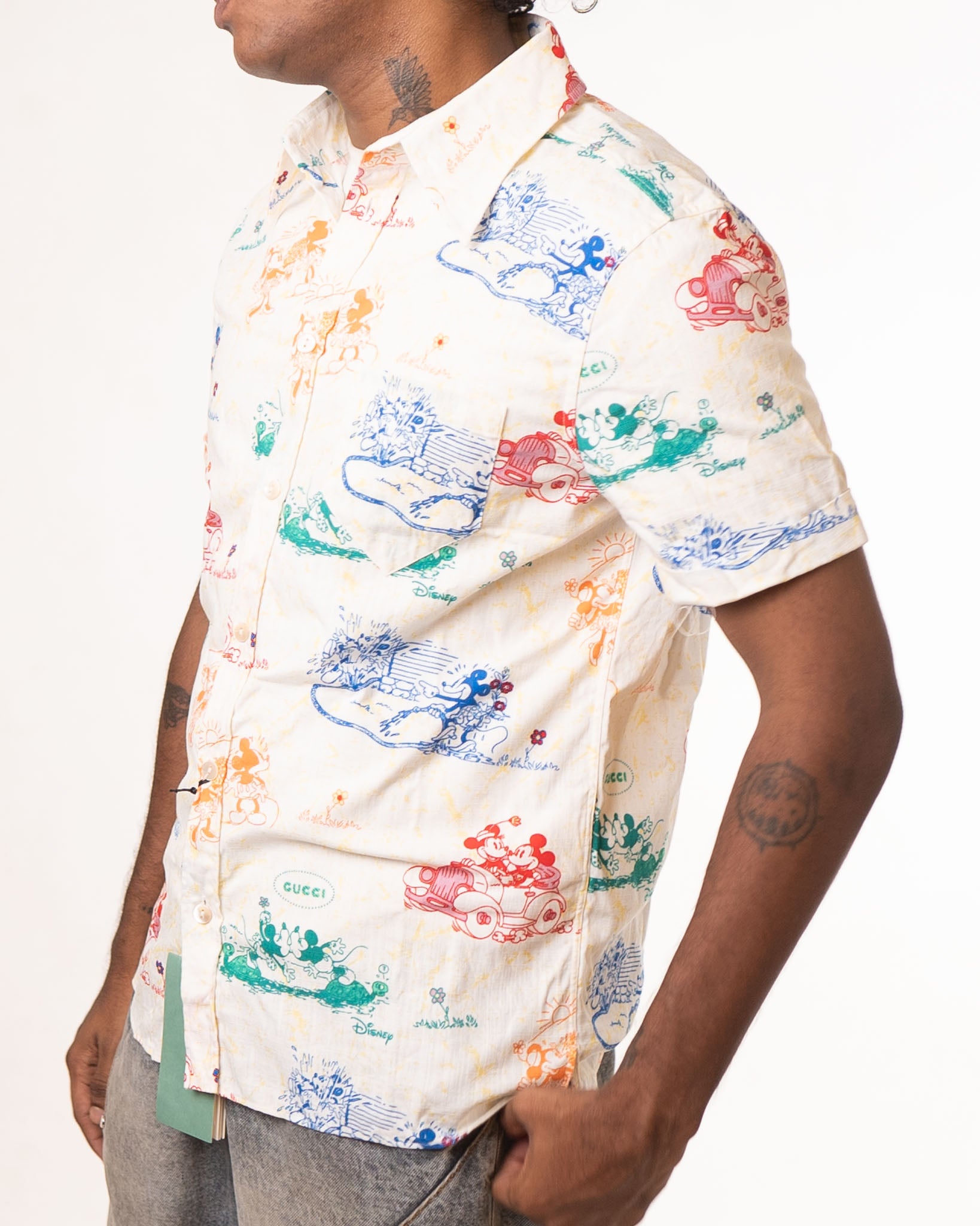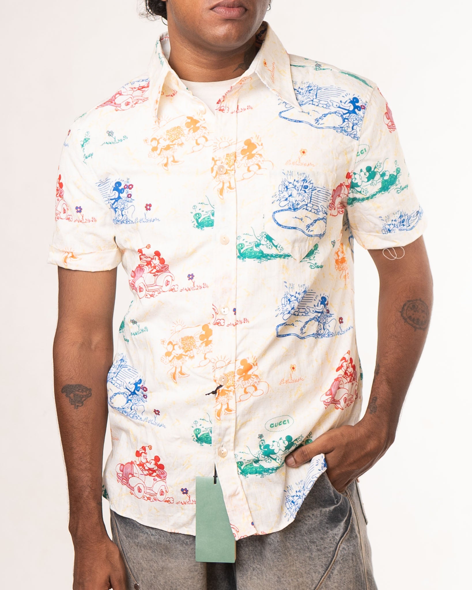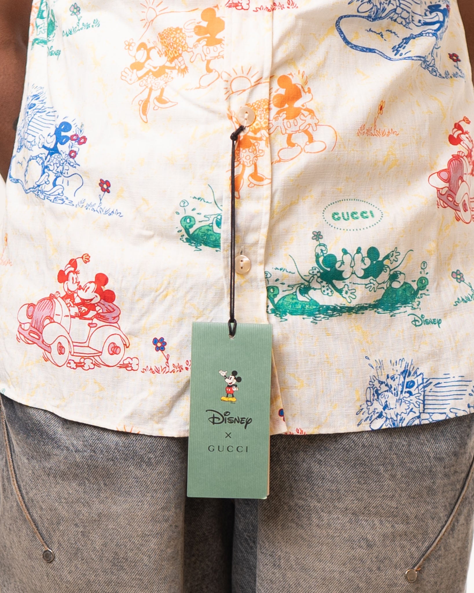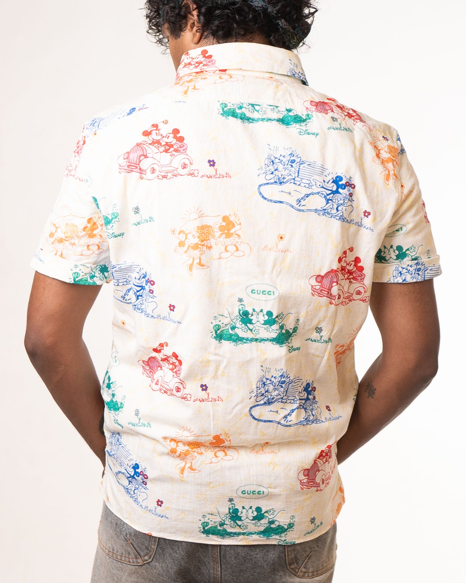 Playful elegance meets luxury: a Gucci x Disney Mickey and Minnie button-up shirt with iconic prints. Playful elegance