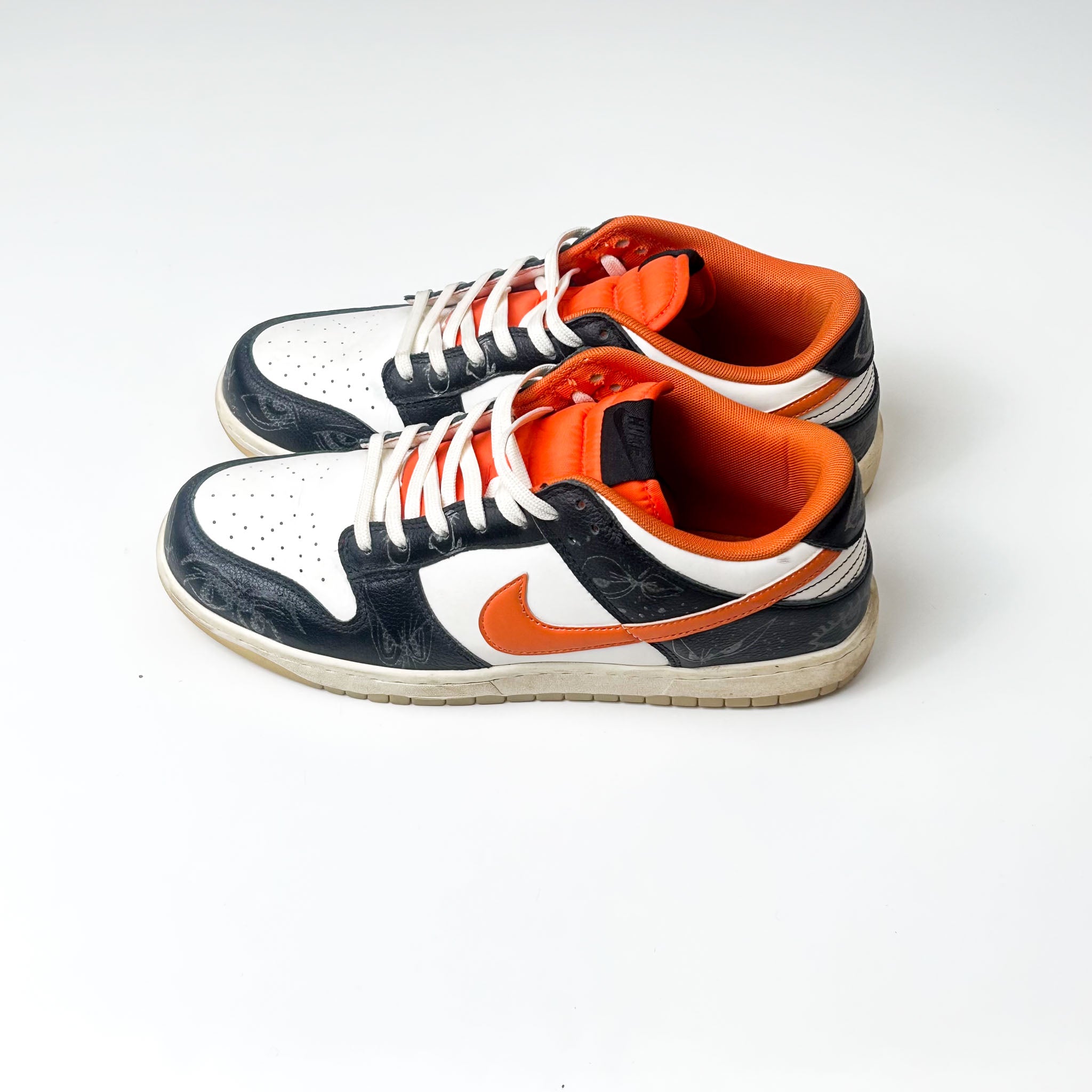 This product is pre-loved in nature. The Nike Dunk Low Premium Halloween features bold orange and black colorways with premium materials, classic styling, and festive flair.