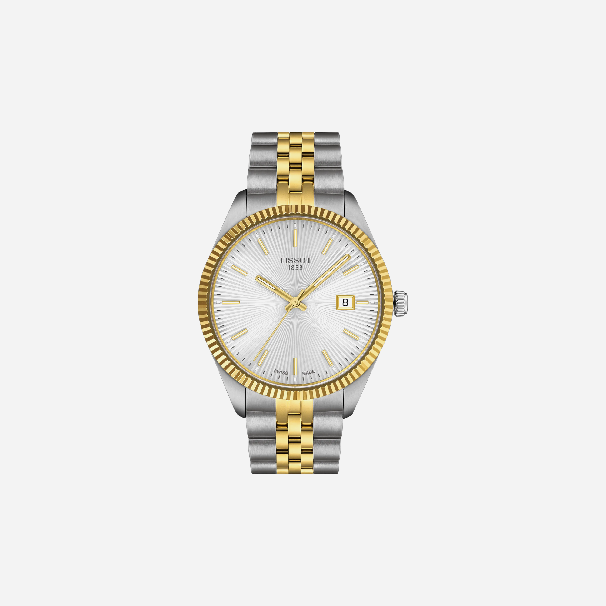The Tissot Ballade 40mm Silver Dial watch is a sophisticated timepiece blending stainless steel with yellow gold PVD coating for a luxurious look. This elegant Swiss made automatic watch is perfect for those seeking classic design and exceptional quality. Elevate your style today.