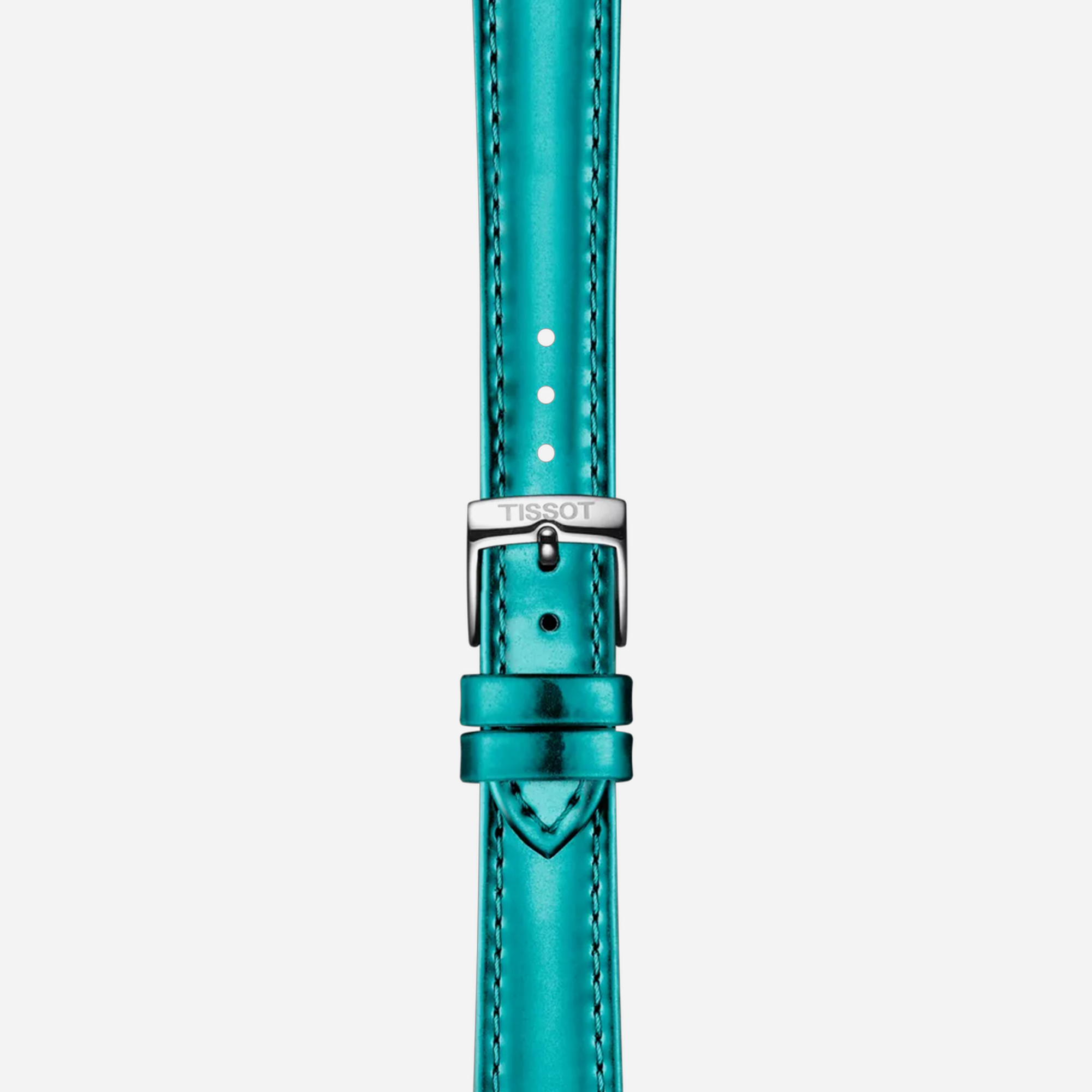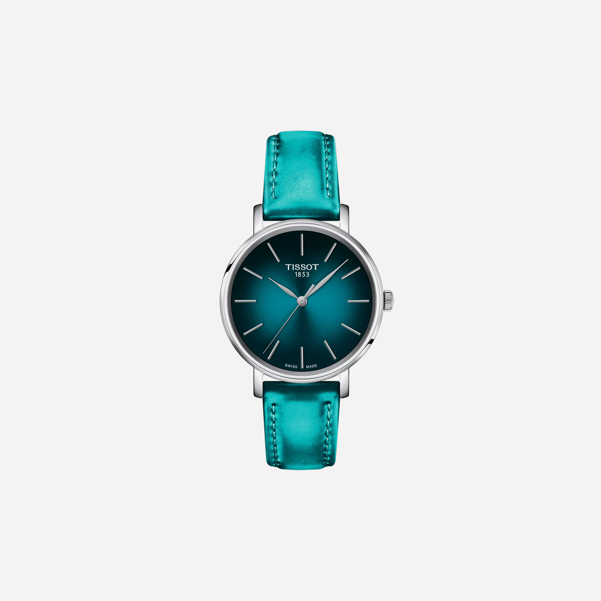 The Tissot Everytime Lady watch features a striking turquoise synthetic strap and a modern stick or dot dial. This elegant timepiece is perfect for women seeking a blend of classic Swiss precision and contemporary style. Its durable design ensures reliability for everyday wear.