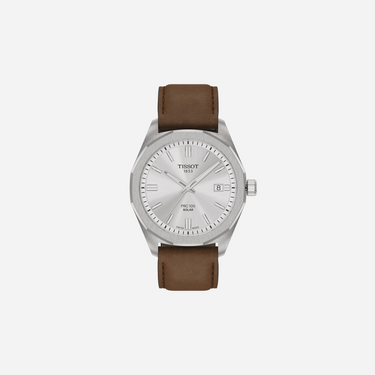 The Tissot PRC 100 Solar Quartz watch is a timeless piece featuring a sophisticated 39mm silver dial and an elegant brown leather strap. This solar-powered timepiece offers precise quartz movement, combining classic style with modern technology for reliable and sustainable everyday wear.