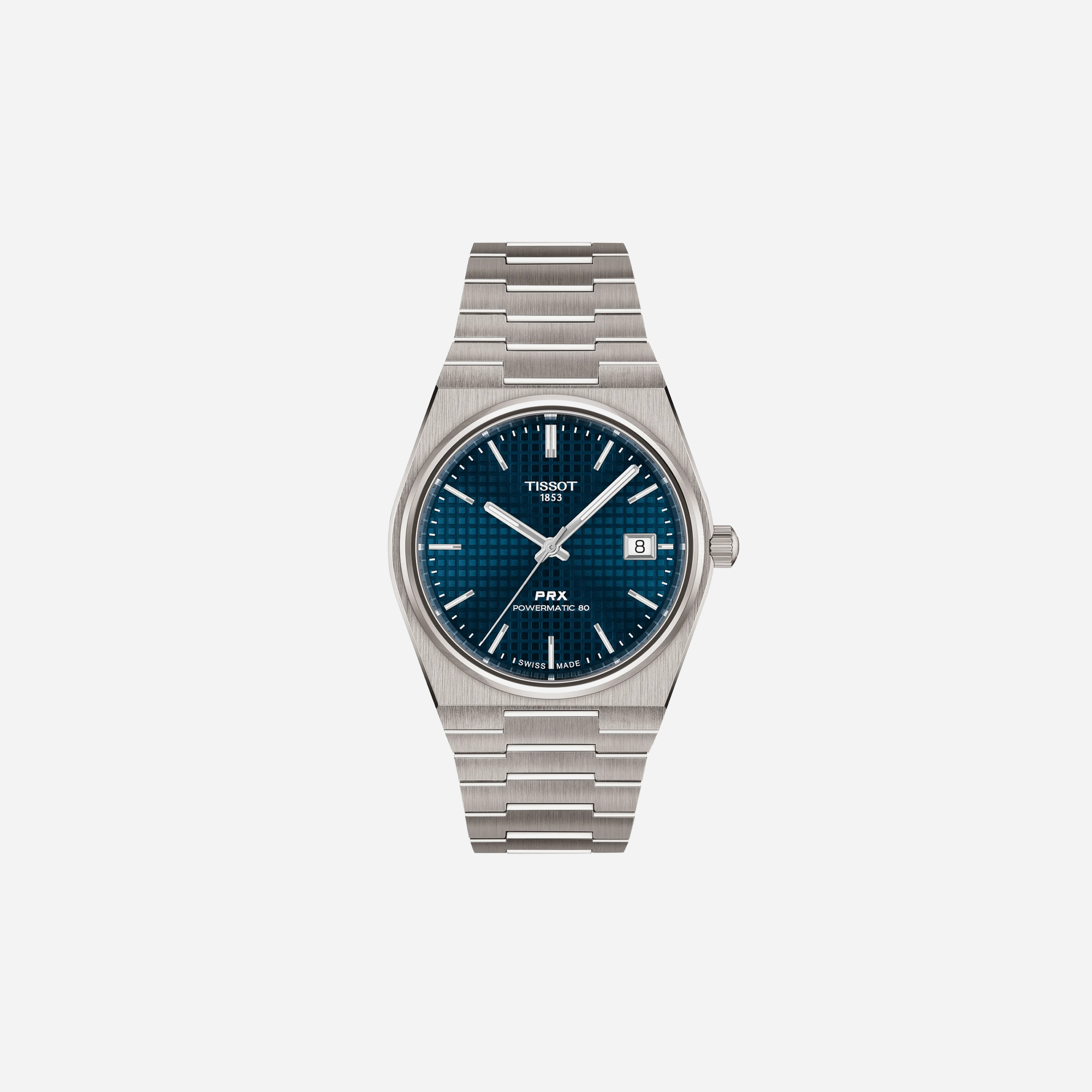 Tissot PRX Titanium watch features a striking blue dial with gray Stainless Steel, combining Swiss precision with modern design. Lightweight titanium construction ensures comfort for daily wear. Perfect for professionals seeking reliable timekeeping and sophisticated style in one exceptional timepiece.