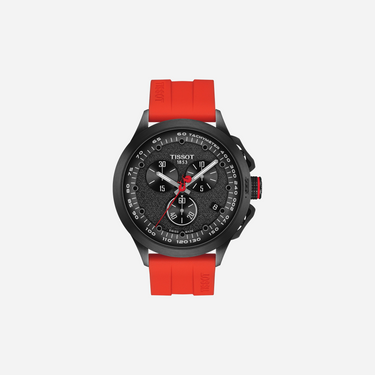 The Tissot T-Race Cycling Vuelta 2023 watch is a stunning chronograph timepiece inspired by competitive cycling. Featuring a bold black dial and a vibrant red rubber strap, this 45mm Tissot watch delivers high-performance style and precision. Perfect for racing enthusiasts, this Swiss watch offers durable construction and exceptional timekeeping accuracy.