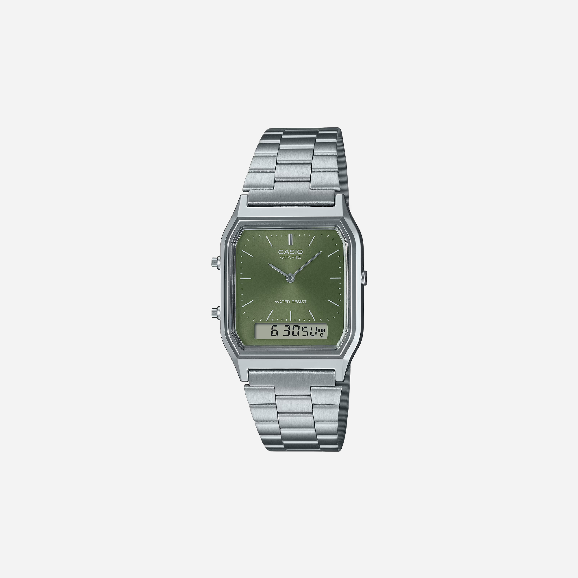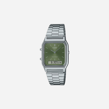 The Casio Vintage AQ-230A-3AMQYDF is a timeless timepiece featuring a striking green dial and durable stainless steel band. This quartz watch blends retro aesthetic with modern reliability making it a perfect accessory for everyday wear. Enjoy the classic analog and digital display for convenience and style.