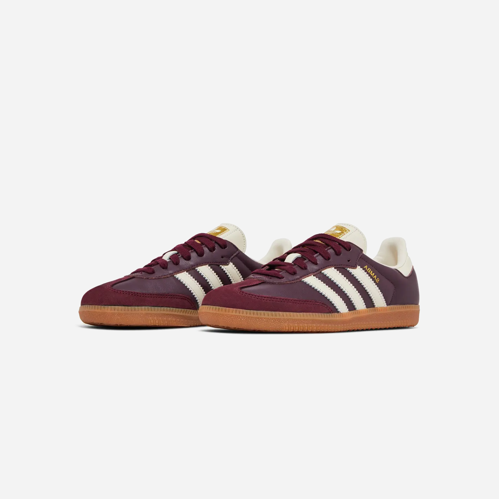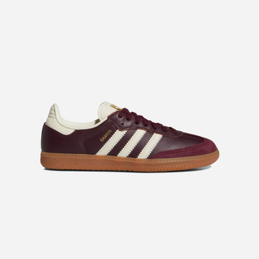 The Adidas Samba OG Maroon Gold Metallic (W) is a stylish nod to classic soccer heritage, designed for both comfort and flair. Featuring a rich maroon upper crafted from premium leather, it exudes sophistication while ensuring durability. The iconic three stripes in striking gold metallic add a touch of elegance, making this sneaker a standout choice for any outfit. With a cushioned insole and supportive rubber outsole, the Samba OG offers all-day comfort and traction. Perfect for casual outings or sporty looks, this shoe combines timeless design with modern appeal, making it a must-have addition to your collection.