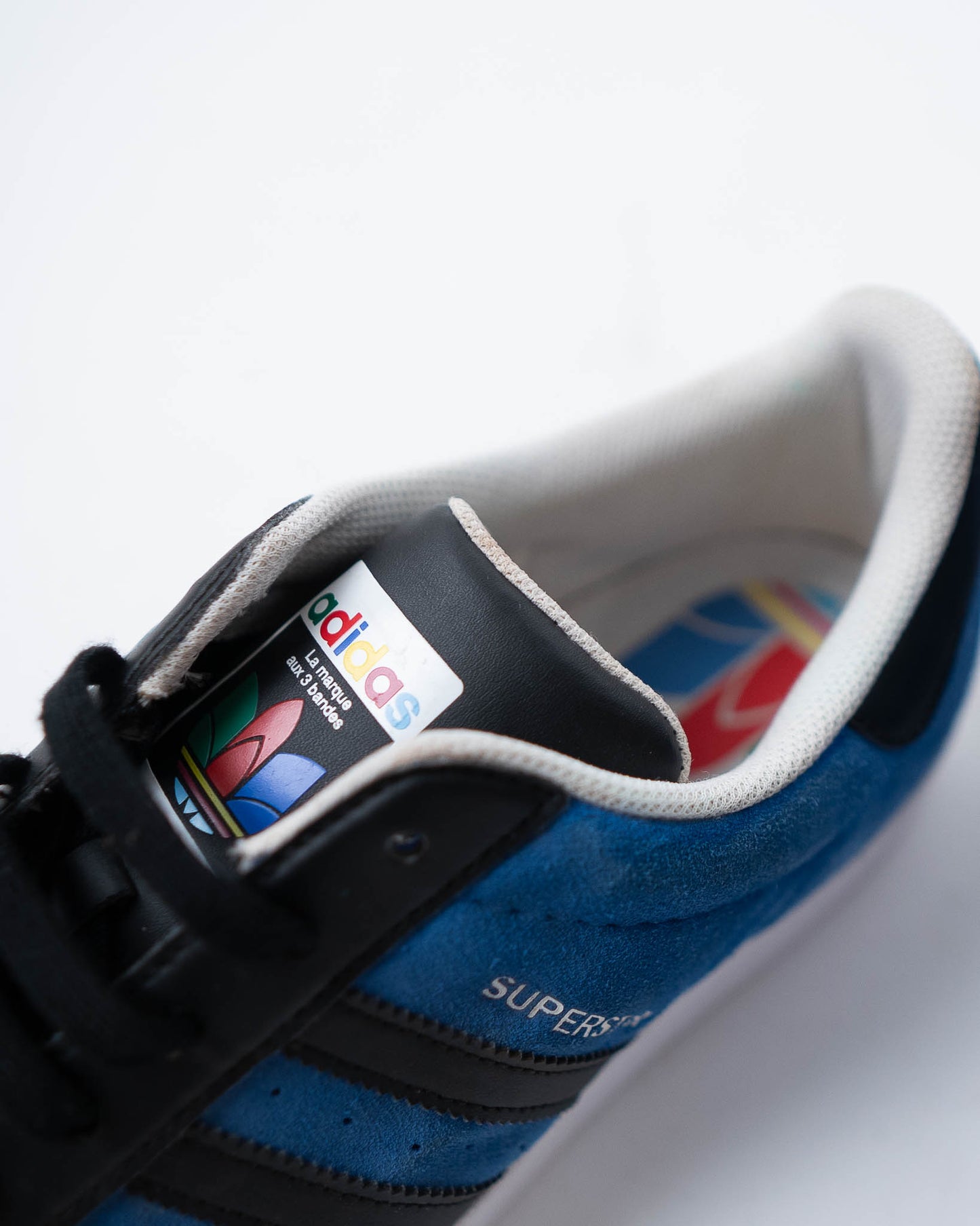 A deadstock, timeless icon, these Adidas Superstar sneakers feature a blue and core black colorway. Deadstock icon
