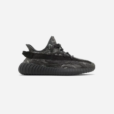 The Adidas Yeezy Boost 350 V2 MX Dark Salt features a marbled Primeknit upper blending shades of grey, black, and muted blue, creating a distinctive swirling pattern. A solid black side stripe and matching heel tab add contrast, while the translucent ribbed midsole houses responsive Boost cushioning for all-day comfort. This versatile design combines style and functionality, making it suitable for both casual wear and athletic activities.