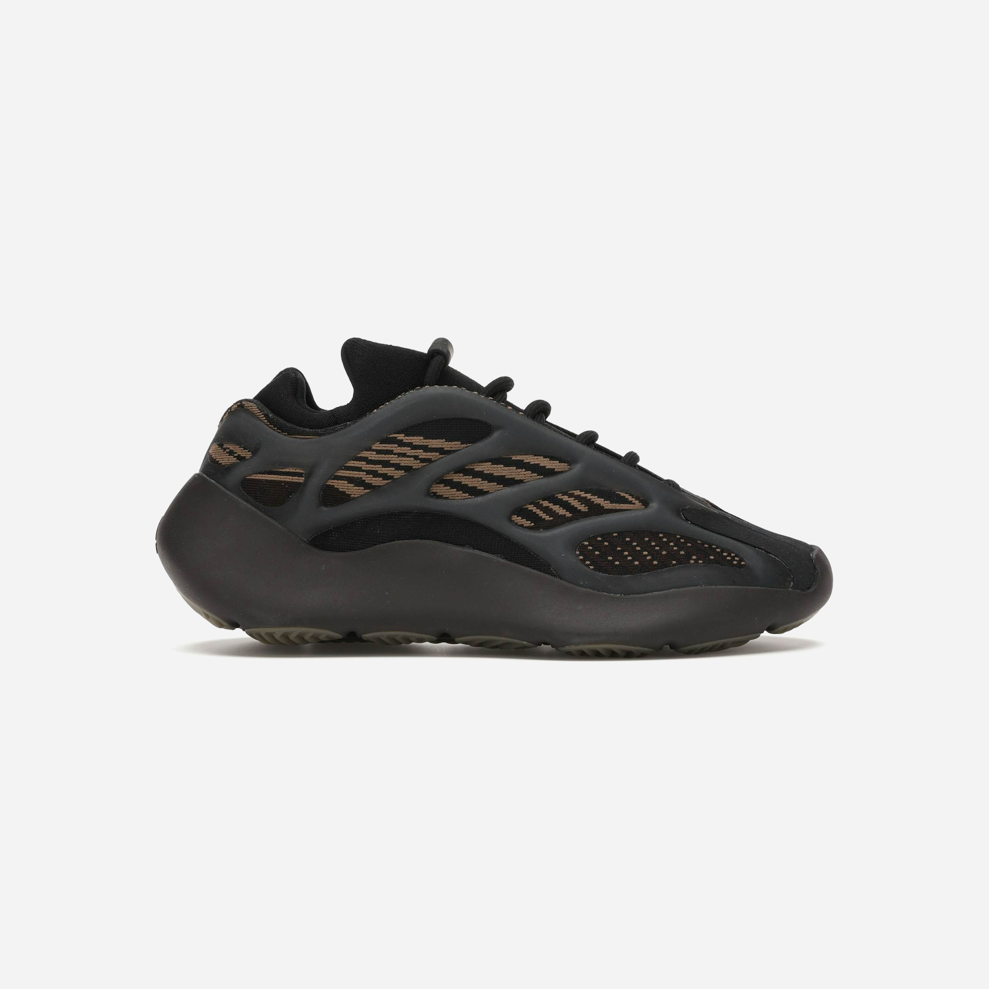 The Adidas Yeezy 700 V3 Clay Brown features a monofilament engineered mesh upper in a mostly black finish, accented with swooping brown stripes across the side panels. These stripes are visible through the open spaces of the RPU cage, which adds structure and a futuristic look to the bootie-like construction. The bulky EVA midsole is encapsulated in a durable PU wrap, while the sneaker is reinforced by a herringbone-tread rubber outsole for superior grip and stability.
