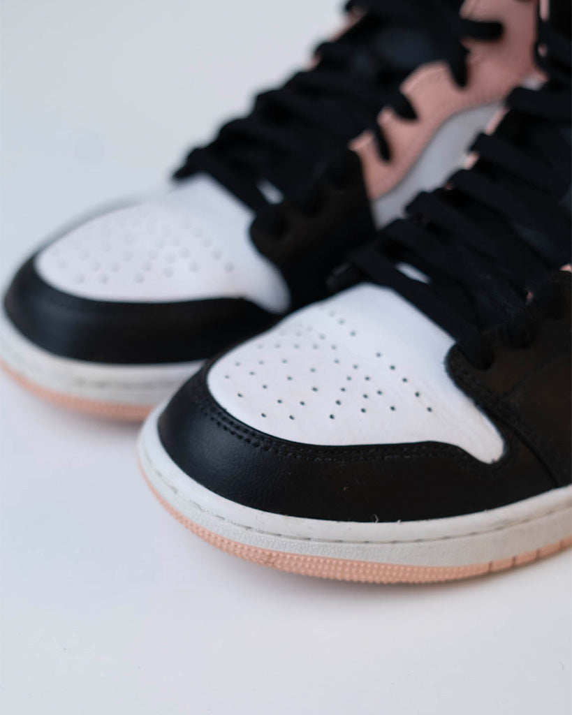This Air Jordan 1 Mid Crimson Tint is an iconic sneaker featuring a leather upper, mid-top silhouette, Air Cushioning, and a bold color.