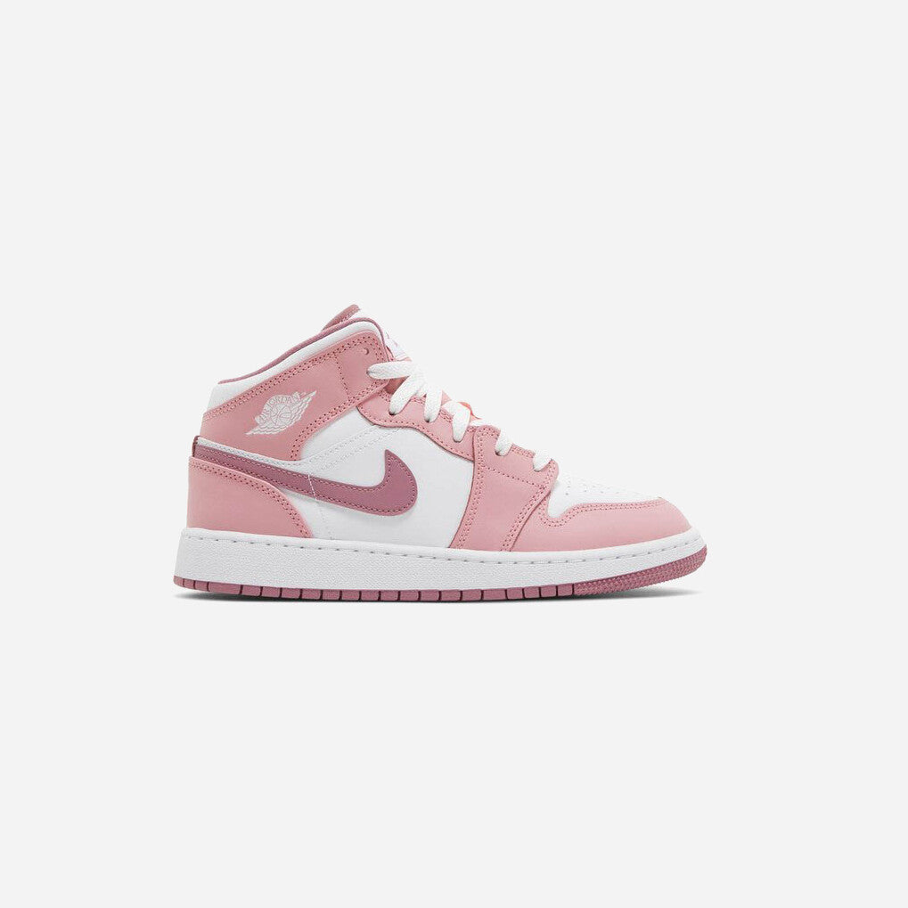 The Air Jordan 1 Mid Valentine's Day 2023 GS is a special edition of the classic Air Jordan 1 silhouette - featuring a pink colorway that pays tribute to Valentine's Day. The shoe features a white leather upper with perforated detailing on the toe box in classic Air Jordan 1 fashion. It also has pink overlays around the midfoot, lace eyelets and around the ankle and heel with stitching all around the upper and midsole synonymous with most shoes on the silhouette. The Swoosh appears in an even darker shade of pink, providing a cool contrasting effect that also extends to the outsole. Branding details on the shoe include the Air Jordan Wings logo on the outer side of ankle and the Jumpman logo with Air branding on the tongue.