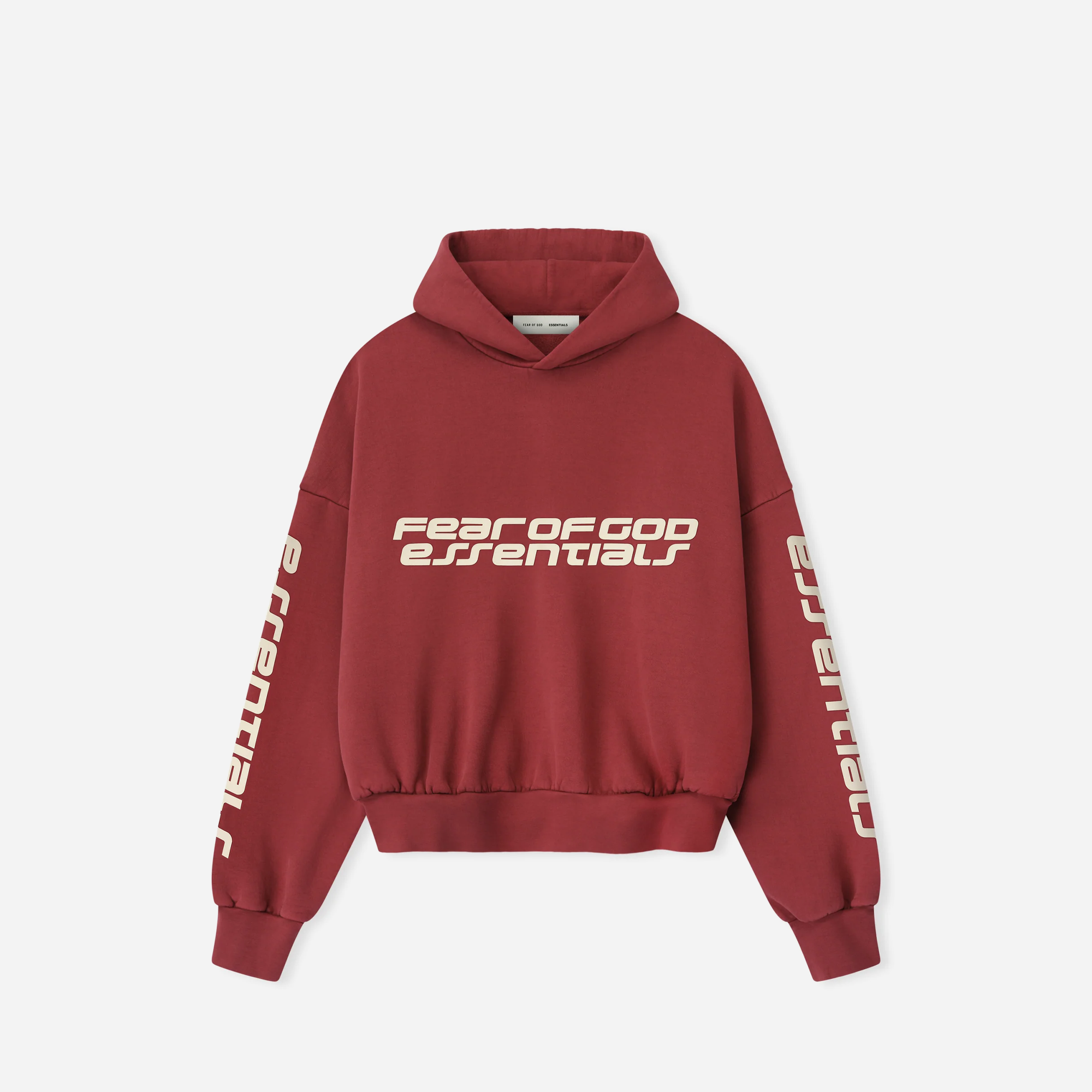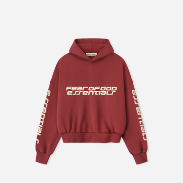 Fear Of God Essentials Crimson Cropped Relaxed Hoodie offers premium comfort with its relaxed fit design. Perfect for casual streetwear styling, this essential piece features quality construction and versatile crimson color. Ideal for layering or standalone wear throughout seasons.