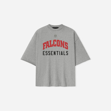 The Fear Of God Essentials Falcons 90s 3/4 Sleeve Football Tee in Concrete Heather blends vintage athletic aesthetics with modern streetwear style. This essential shirt features a comfortable 90s fit perfect for layering or making a standalone statement. Experience premium quality fabric and detail for an elevated wardrobe addition.