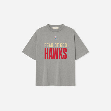 The Fear of God Essentials Hawks 90s Tee in Dark Heather offers a premium blend of comfort and vintage style perfect for streetwear fans. This collectible t-shirt features a relaxed 90s fit honoring the Atlanta Hawks. Elevate your look with this essential piece of apparel.