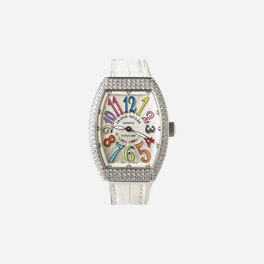 The Franck Muller Color Dreams watch features a chic grey dial and is paired with a luxurious leather strap. This 32mm womens timepiece showcases the brand's iconic design with vibrant, colorful Arabic numerals. It is a stunning Franck Muller accessory that seamlessly blends elegance and playful sophistication for the modern woman.