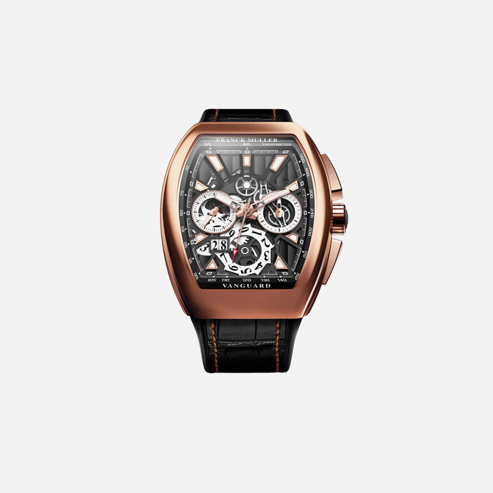 The Franck Muller Vanguard Black Dial Leather Strap Watch is a sophisticated timepiece. This luxury watch, identified by the model V 45 CC GD SQT NR, features a bold black dial and a premium leather strap. A perfect accessory for the discerning collector looking for a statement piece in fine watchmaking.