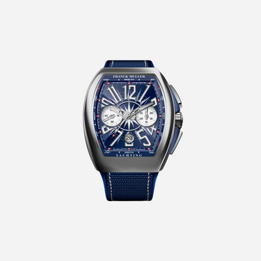 The Franck Muller Vanguard Blue Dial Watch features a bold blue dial and a durable nylon fabric strap perfect for a sophisticated yet sporty look. This luxurious timepiece, model V45 CC DT YACHTING AC.BL, offers precise timekeeping and contemporary style for the modern watch enthusiast.