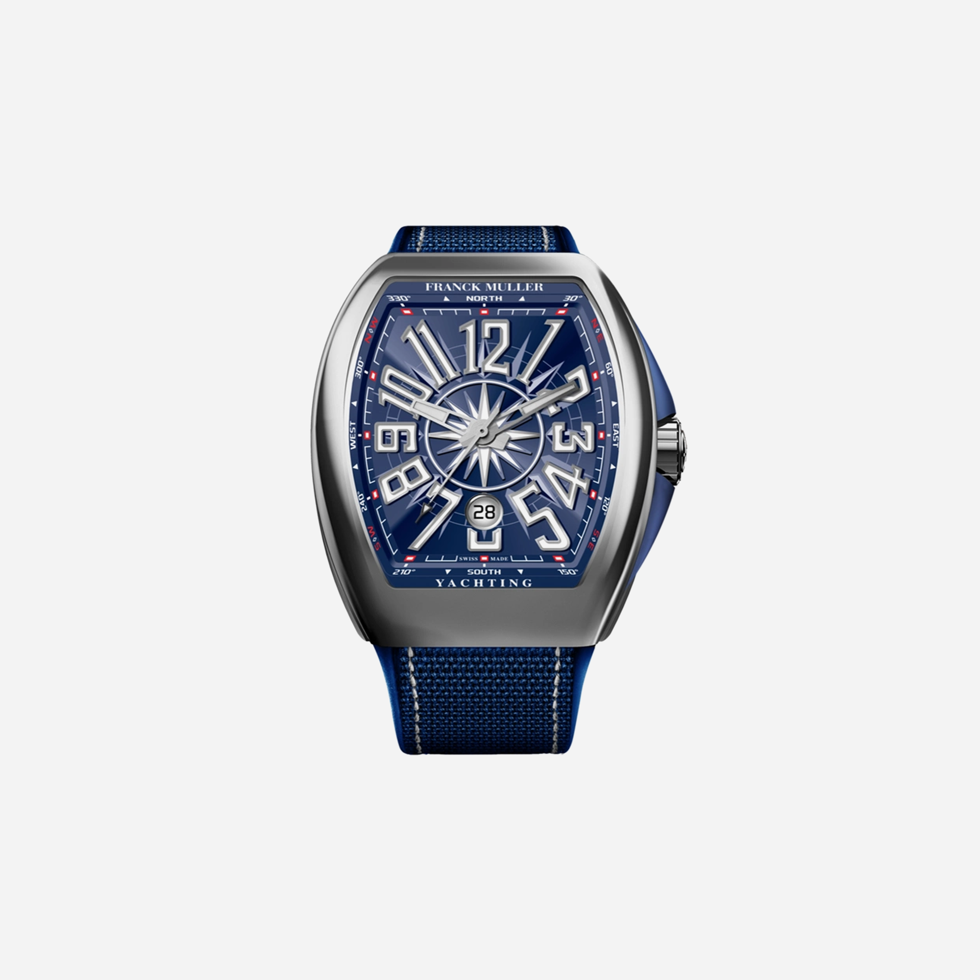 The Franck Muller Vanguard Blue Dial watch is a sophisticated timepiece featuring a striking blue dial and a durable nylon fabric strap. This luxury watch, model V45 SC DT YACHTING AC.BL, boasts a 45mm case size, making it a bold statement accessory. This stylish watch is a must-have for enthusiasts.