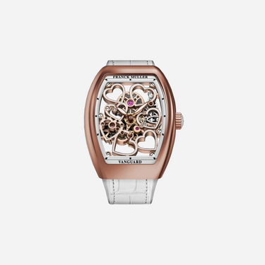 The Franck Muller Vanguard Heart Skeleton Watch features a striking skeleton dial showcasing the intricate mechanical movement. This luxury timepiece with a 35mm size and leather strap is a sophisticated accessory for women. It is a stunning Franck Muller watch that combines exquisite craftsmanship with a bold, contemporary design.