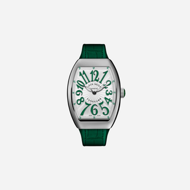 The Franck Muller Vanguard Lady watch features an elegant grey dial and luxurious leather strap. This 32mm timepiece offers a sophisticated design, perfect for women seeking a blend of modern style and high-end watchmaking. It is a stunning accessory for any occasion.
