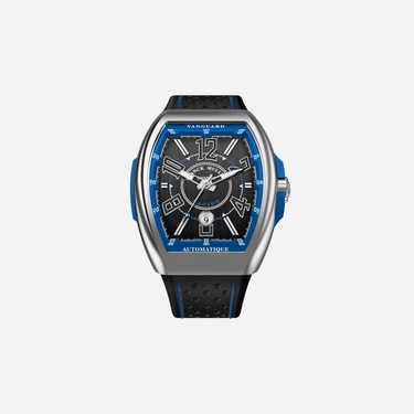 The Franck Muller Vanguard Racing watch features a bold black dial and a comfortable leather strap, perfect for the enthusiast seeking a high-performance luxury timepiece. This 45mm automatic Swiss watch merges sporty aesthetics with meticulous craftsmanship. Experience unparalleled style and precision with this distinguished Franck Muller model.