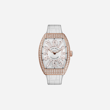 The Franck Muller Vanguard White Dial Watch for women is a luxurious timepiece featuring a sleek white dial and an elegant leather strap. This sophisticated 32mm watch combines contemporary design with classic watchmaking excellence. A stunning accessory to elevate any look, perfect for the modern woman.