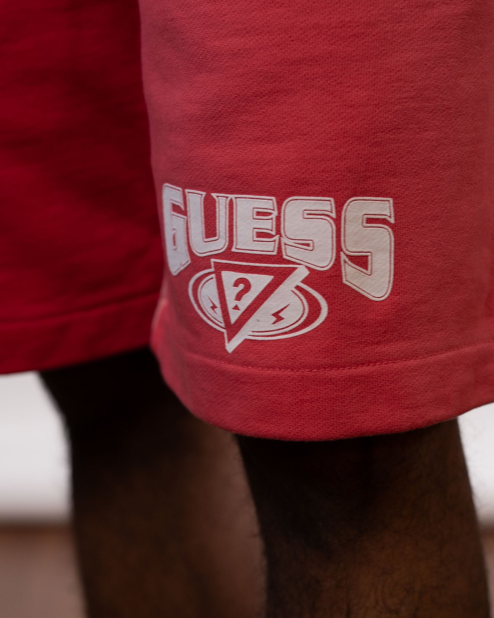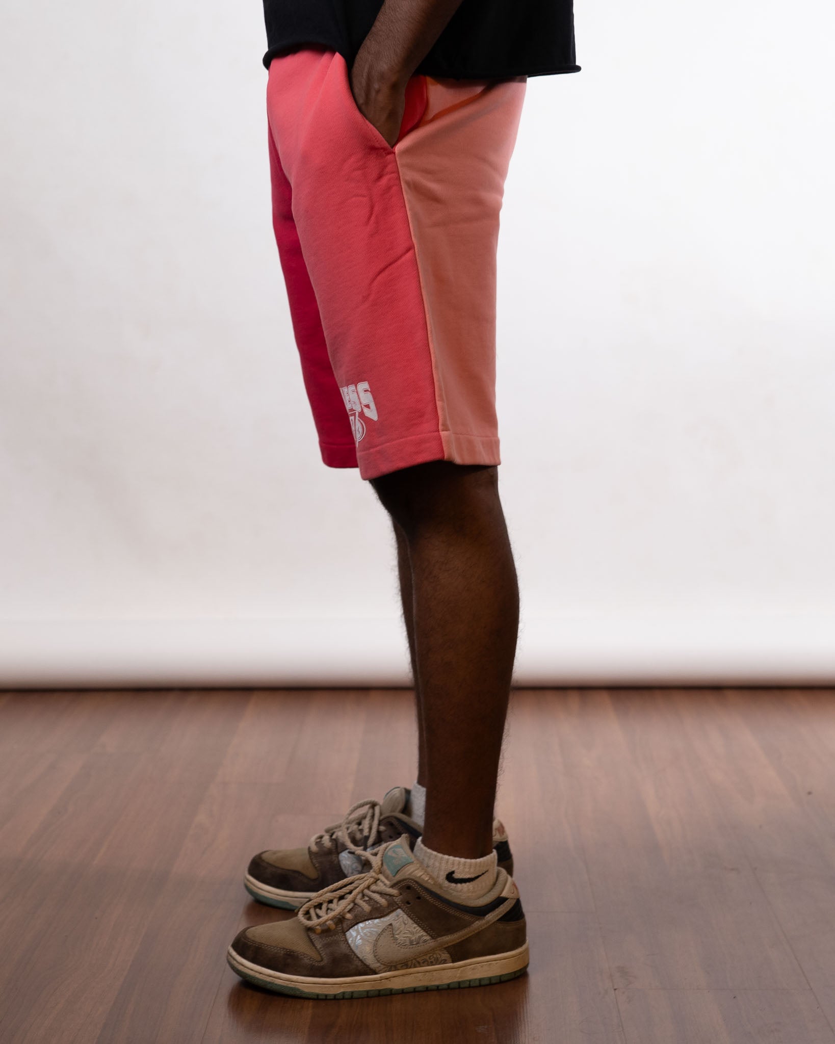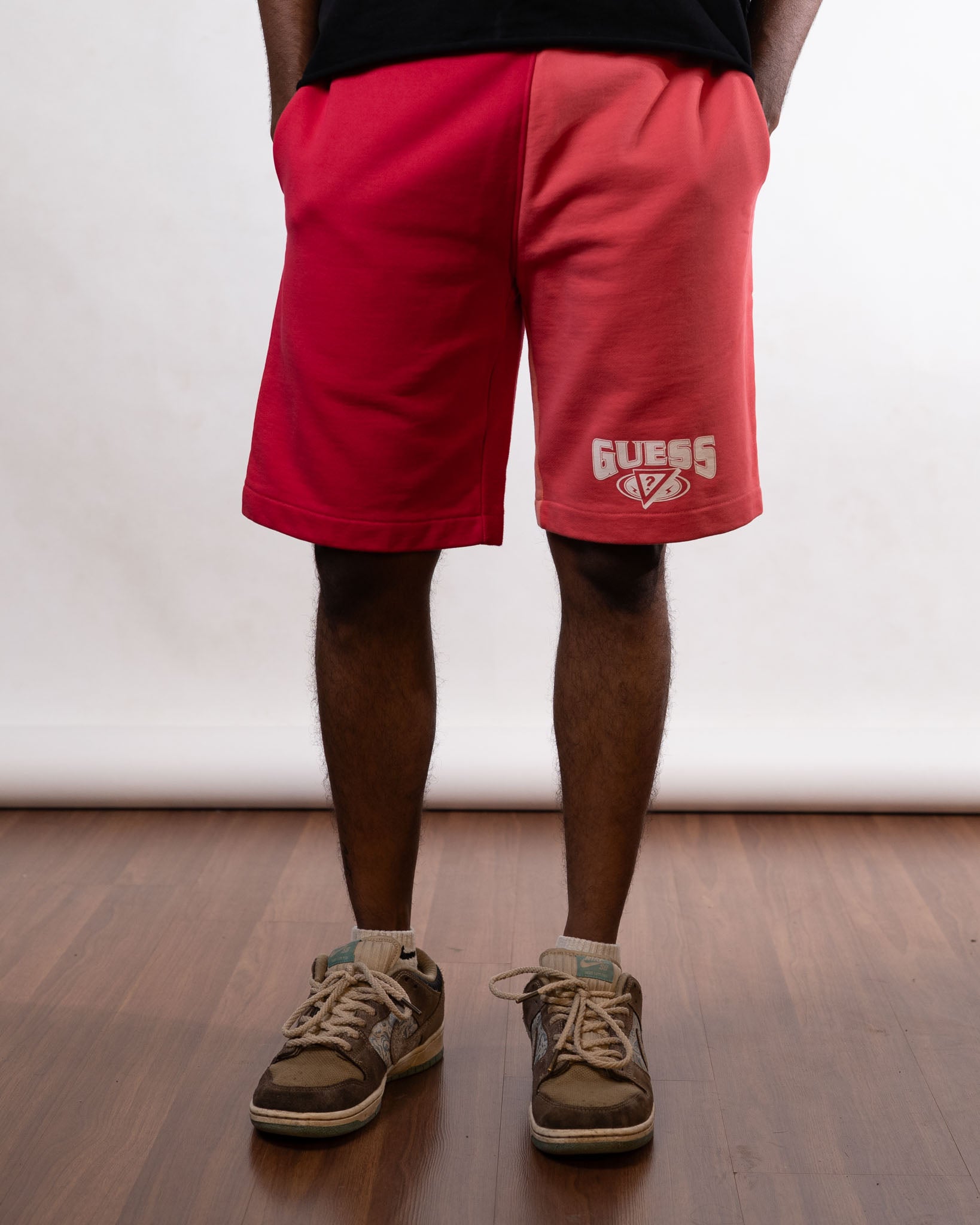 Vibrant pink and orange color-blocked sweatshorts from the Guess x J Balvin collaboration, blending comfort and standout style. Vibrant colors