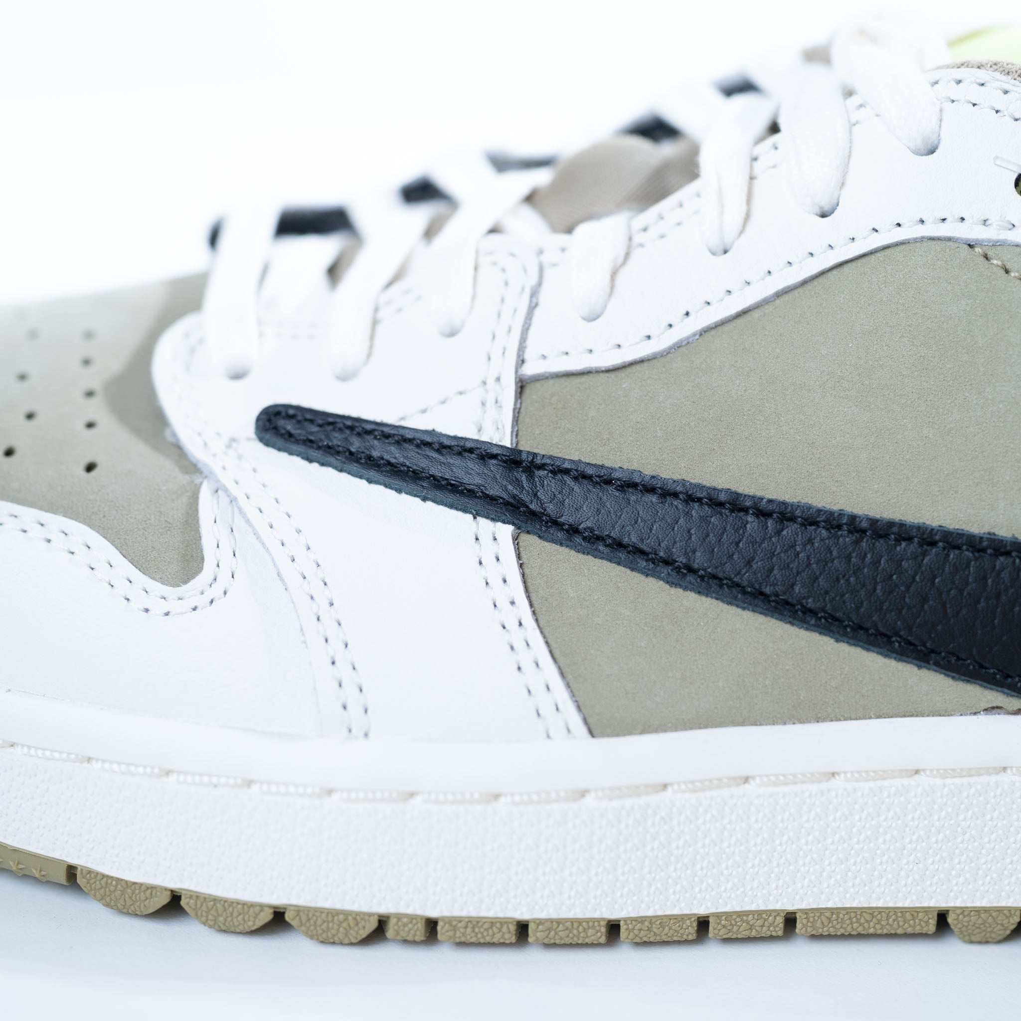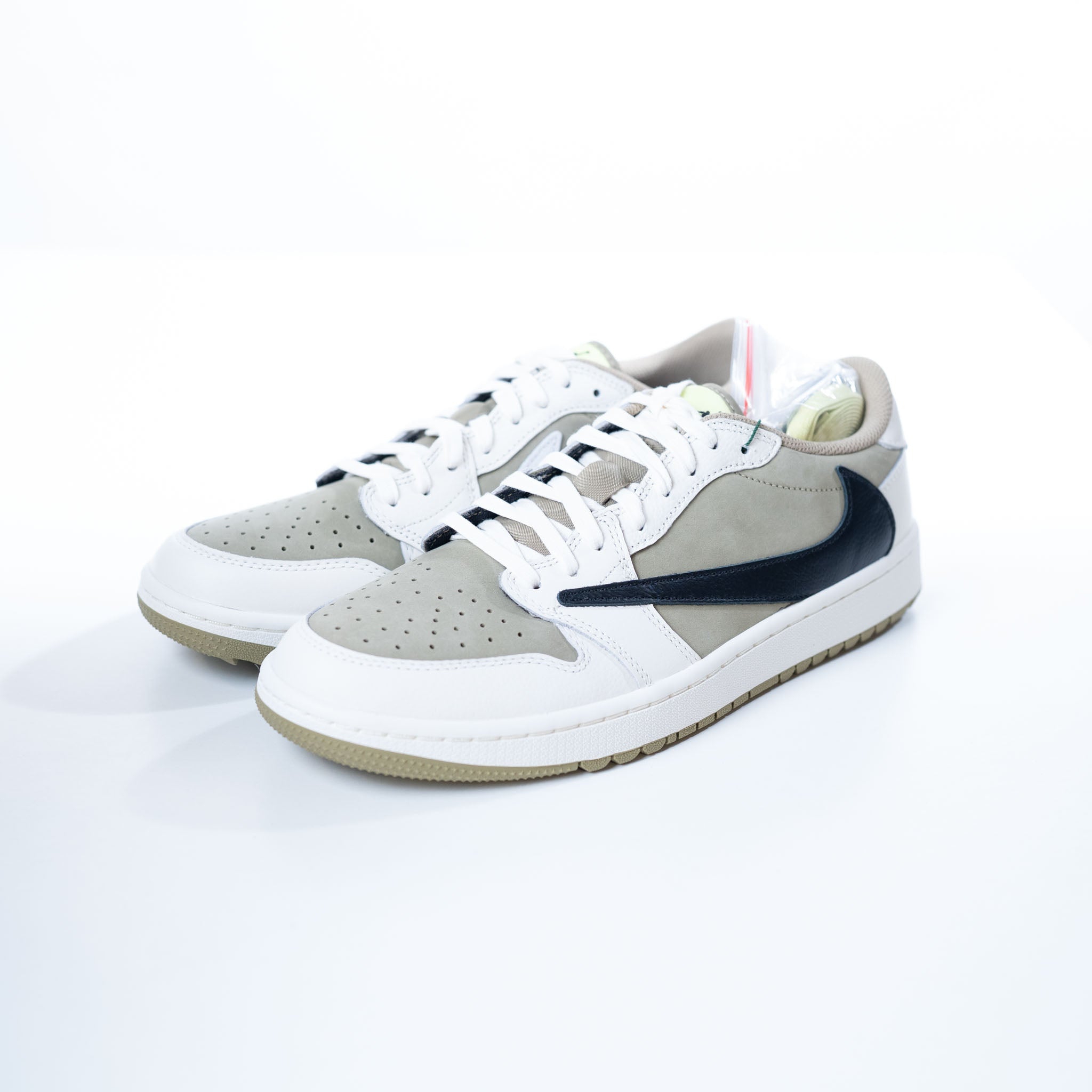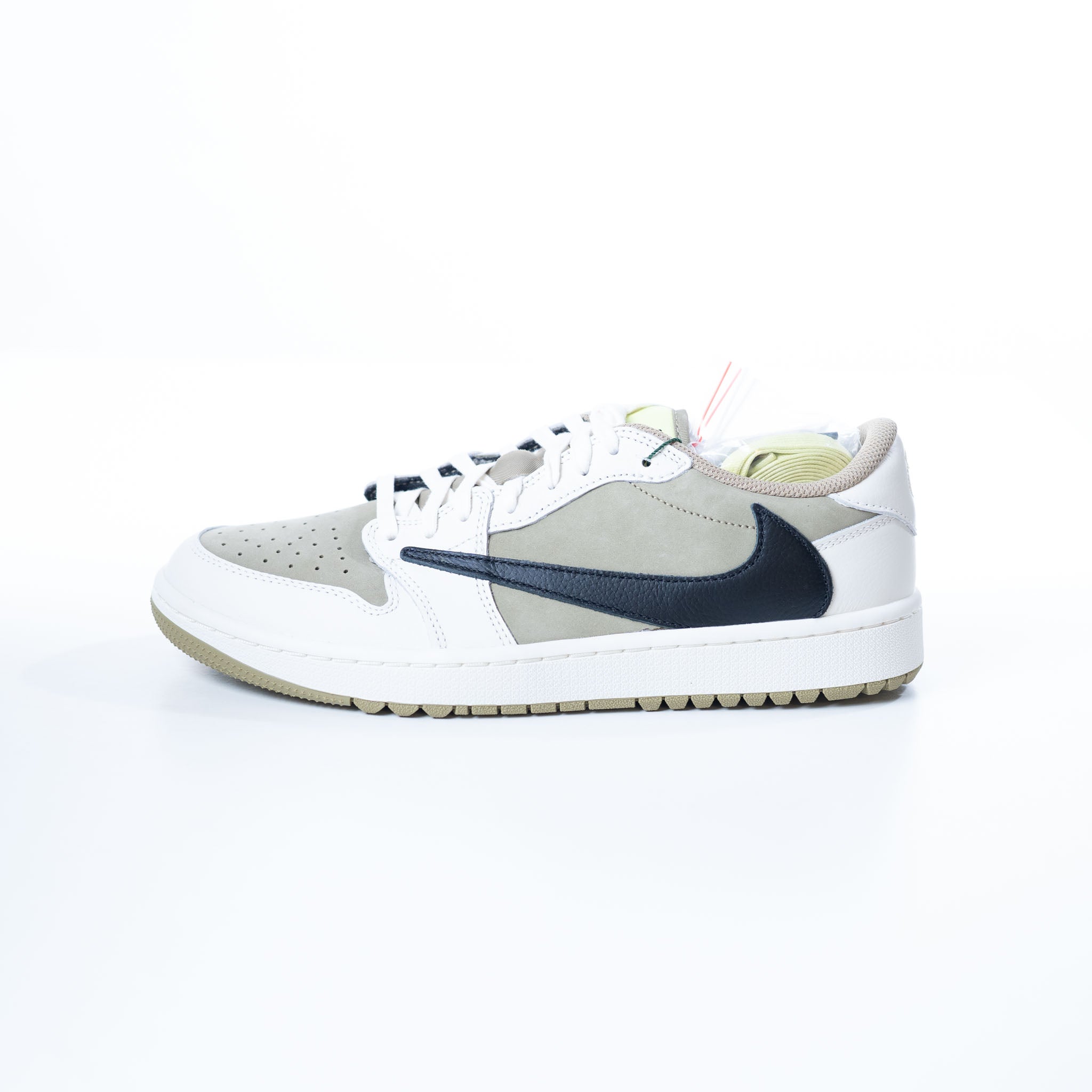 Travis Scott's Jordan 1 Low Golf shoe features earth-toned olive suede and sail leather, blending iconic style with golf performance. Earth-toned low-top