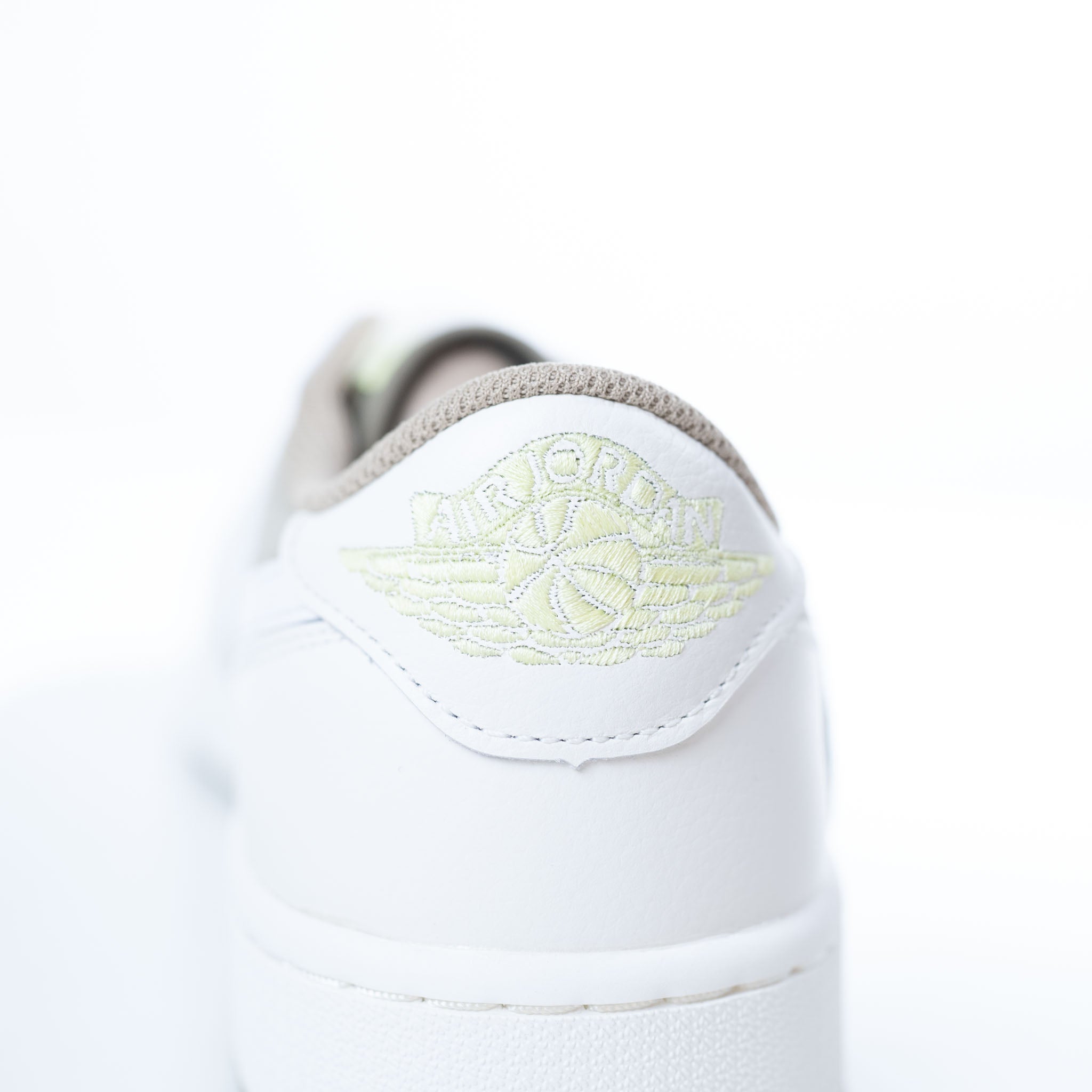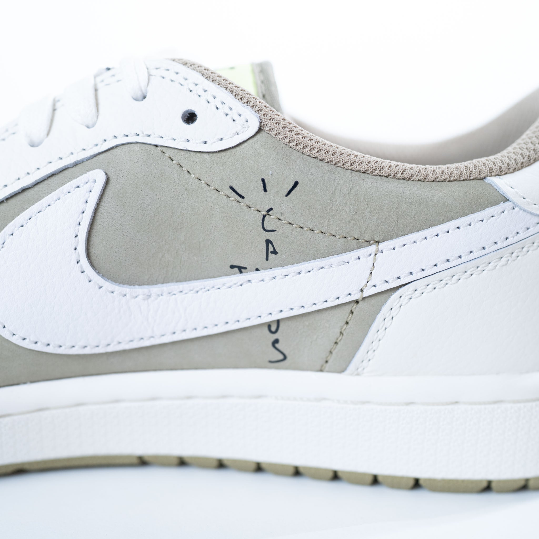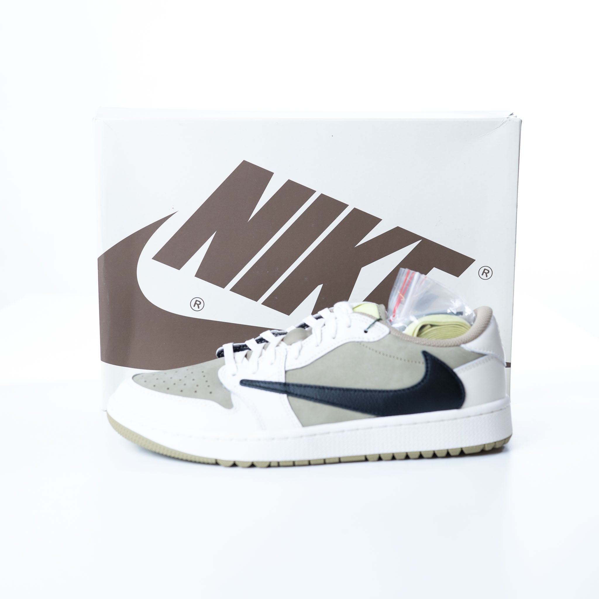 Travis Scott's Jordan 1 Low Golf shoe features earth-toned olive suede and sail leather, blending iconic style with golf performance. Earth-toned low-top