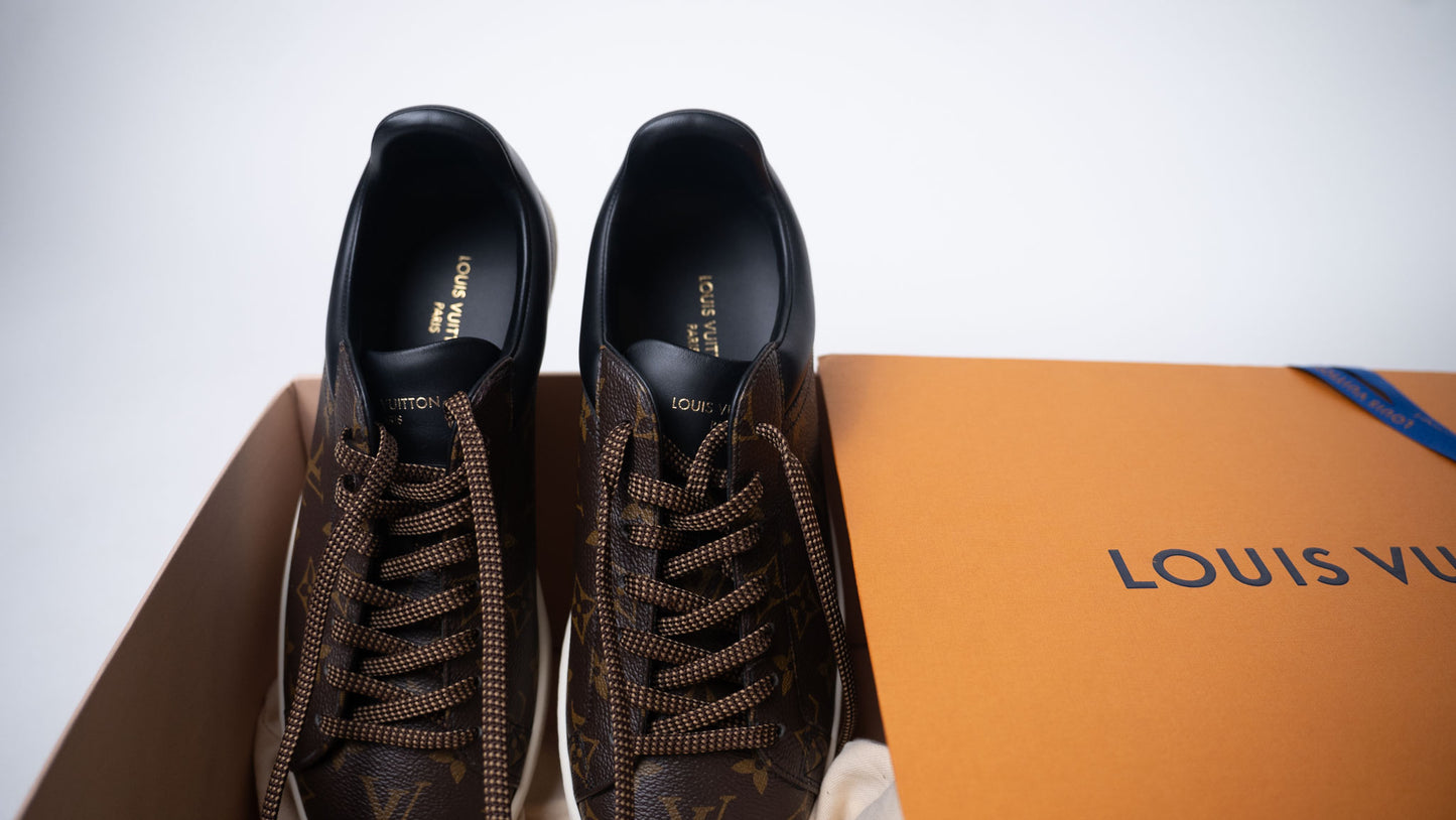 Iconic Louis Vuitton Luxembourg sneakers featuring monogram canvas and smooth leather for a timeless look. Iconic monogram
