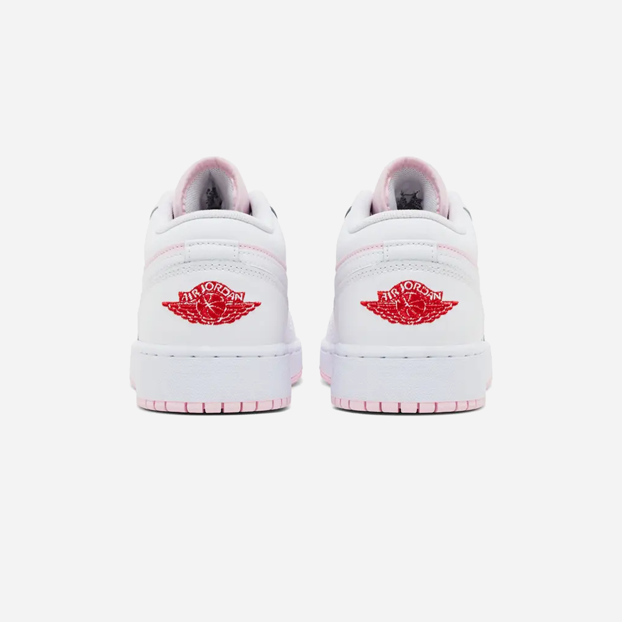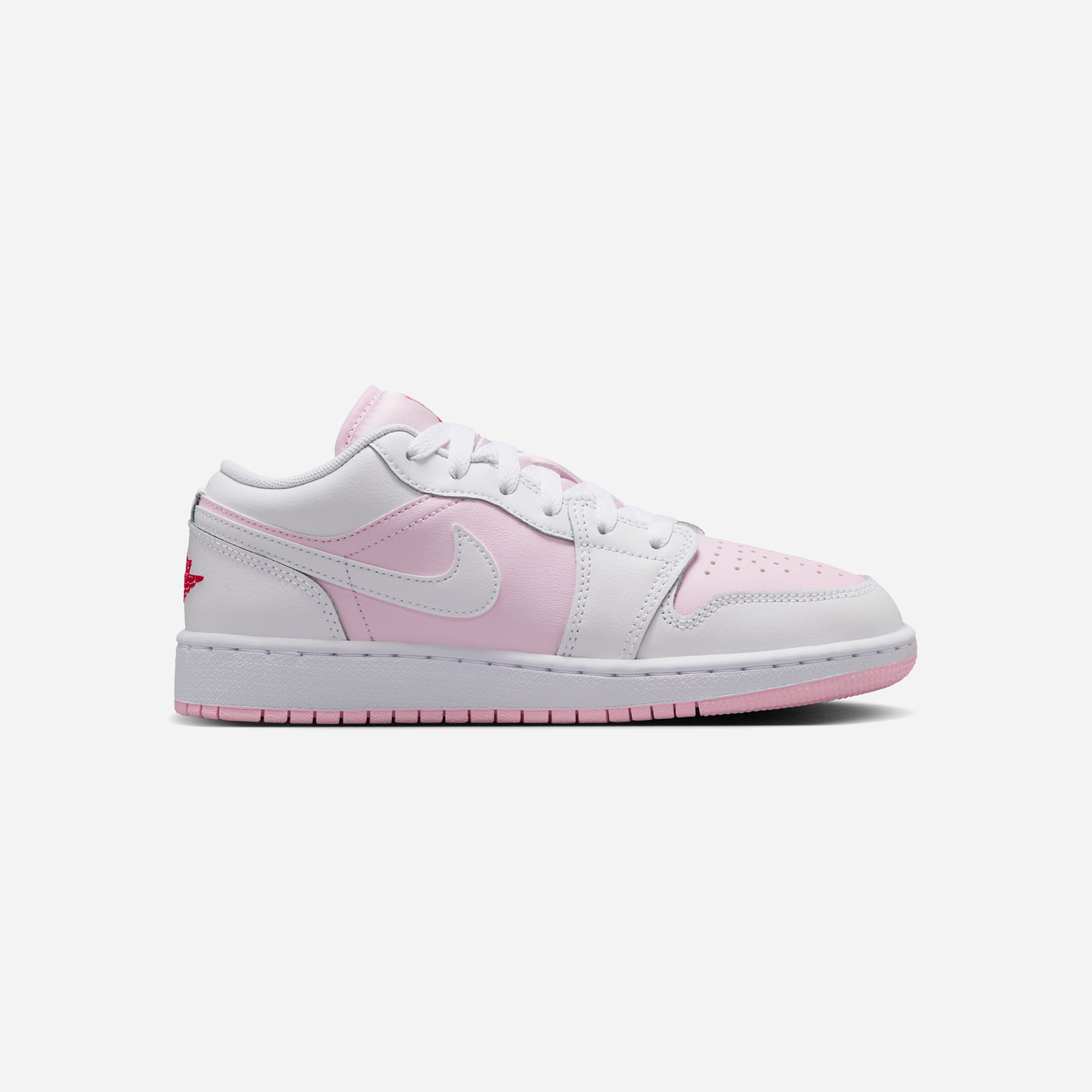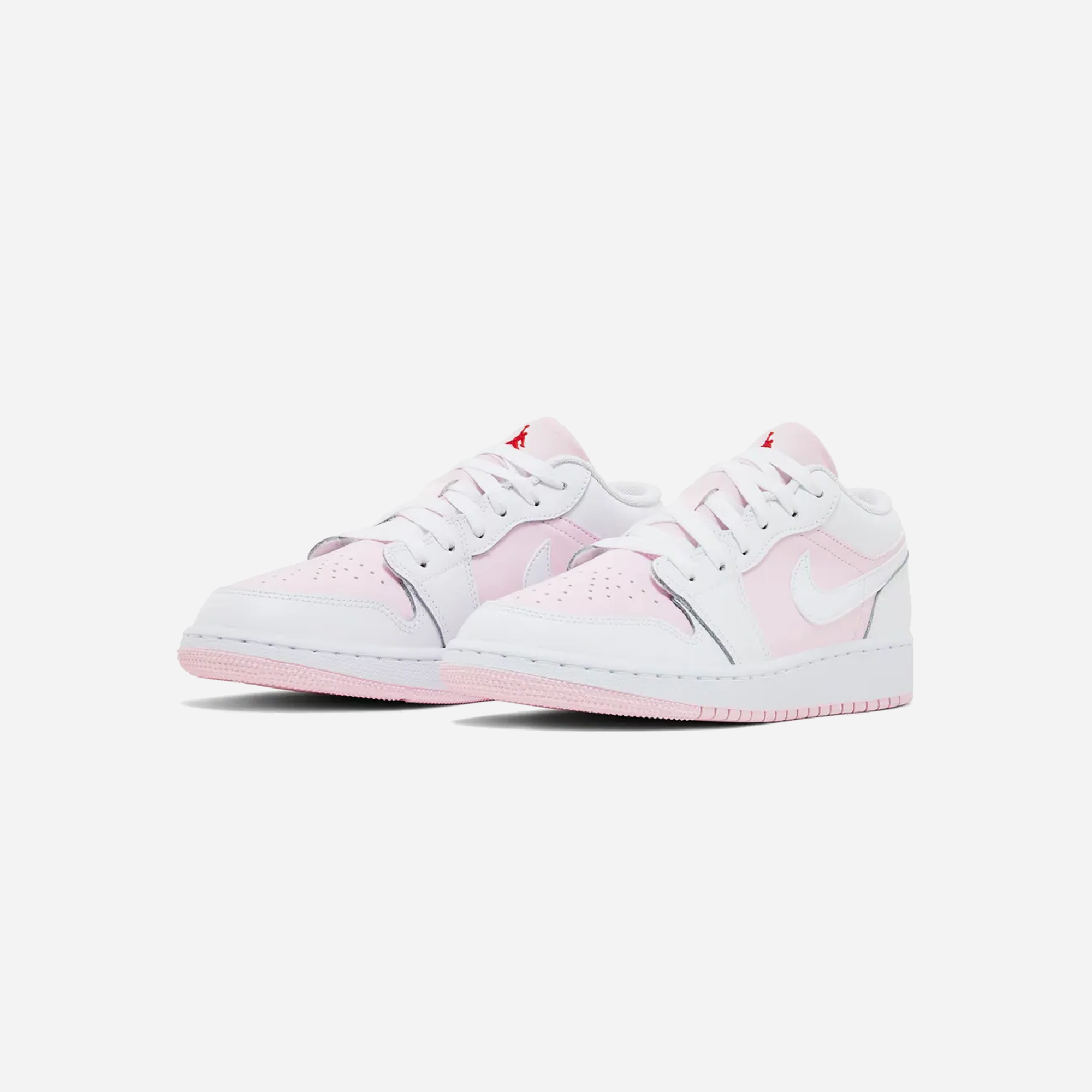 The Air Jordan 1 Low 'Pink Foam' is a vibrant iteration of the classic silhouette, tailored specifically for grade school sizes. This model features a bright pink and white color scheme, with genuine and synthetic leather plus textile materials in the upper ensuring optimal structure and durability. The design is completed with a white midsole and a pink rubber outsole, offering a fresh and stylish look.