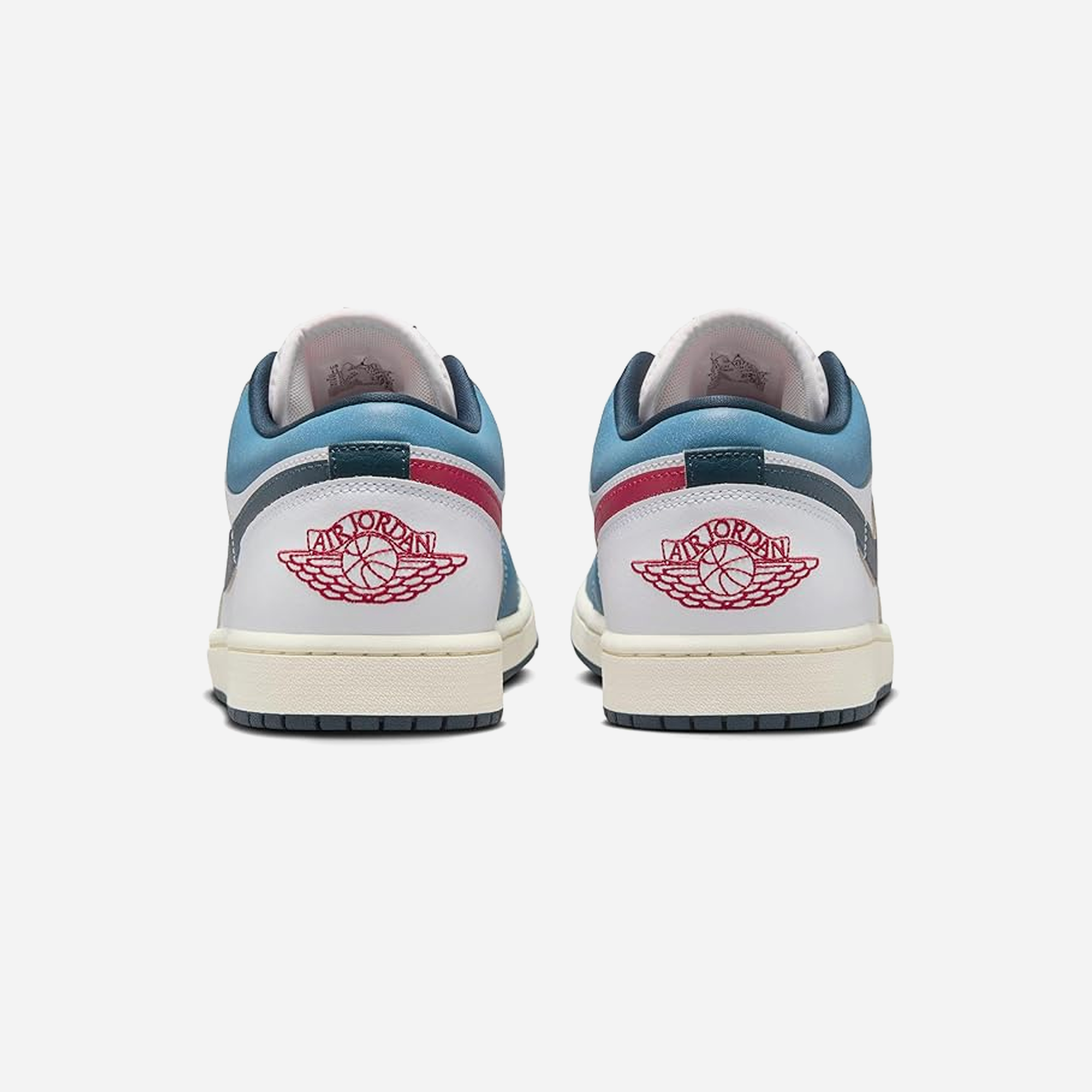 The Air Jordan 1 Low SE 'Armory Navy' is a special edition sneaker that combines classic design elements with modern aesthetics. This model features a white leather base with 'Aegean Storm' blue overlays, creating a striking contrast. The lateral side showcases an 'Armory Navy' Swoosh, while the medial side features a red Swoosh, adding a unique asymmetrical touch. The tongue displays a red Jumpman logo with motion blur stripes, giving the sneaker its 'Motion' nickname. Additional details include a red Air Jordan Wings logo embroidered on the heel and a rubber outsole for traction.
