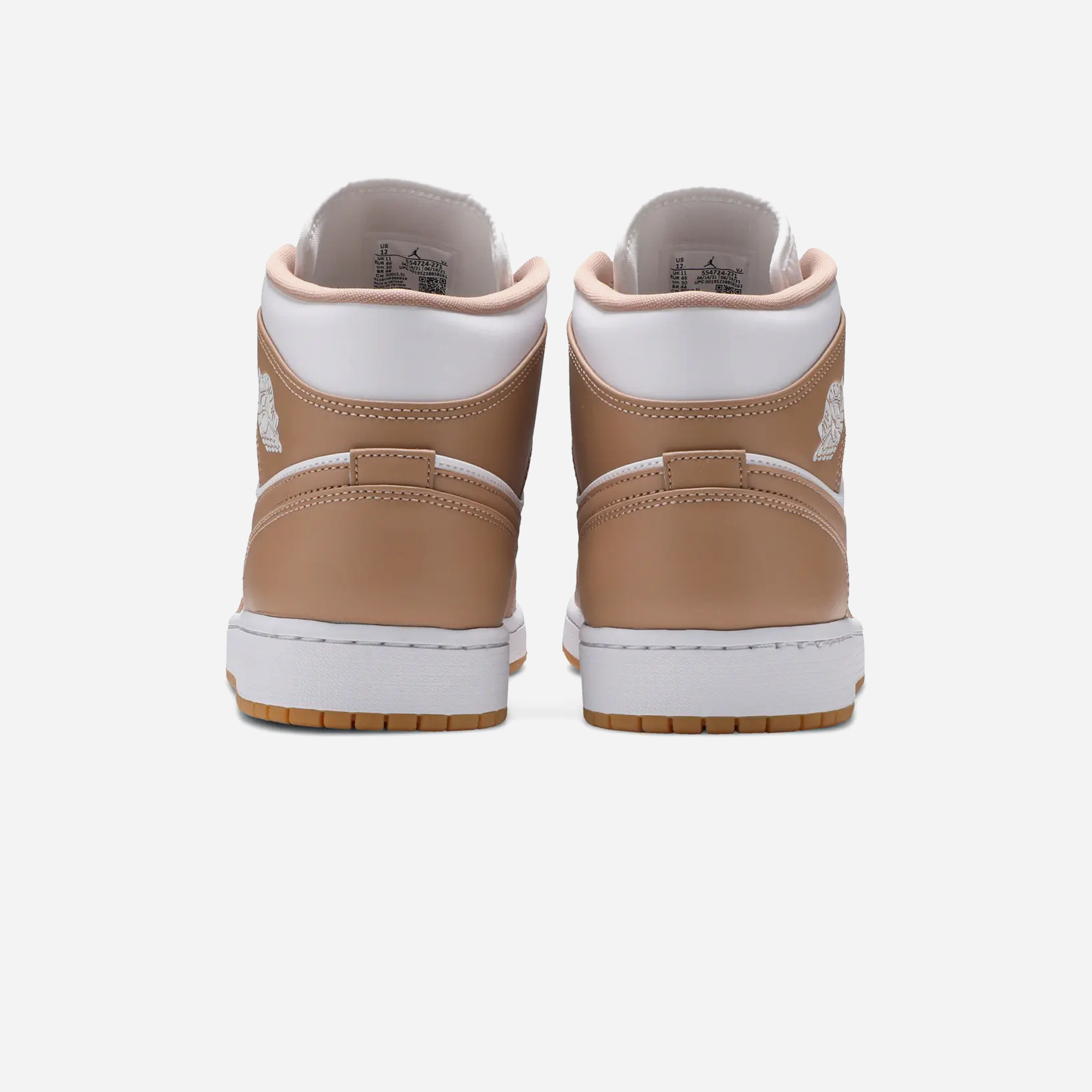 The Jordan 1 Mid Tan Gum features a white leather upper with Tan overlays and Swooshes. At the collar, a signature Air Jordan Wings logo is printed in white, similar to the original 1985 Air Jordan 1. From there, a Jumpman tongue label and gum outsole add the finishing touch.