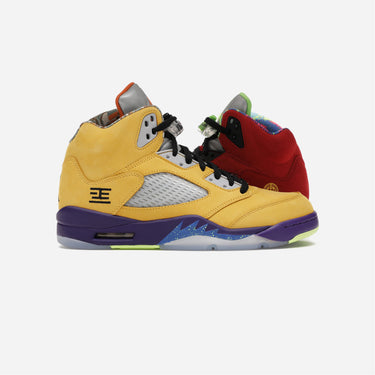 The Nike Air Jordan 5 Retro What The sneaker is a highly anticipated release celebrating the model's 30th anniversary. This unique edition mashes up design elements and colors from some of the most iconic Air Jordan 5 releases in history. It features a vibrant multicolor design perfect for collectors and enthusiasts looking for a bold statement shoe.