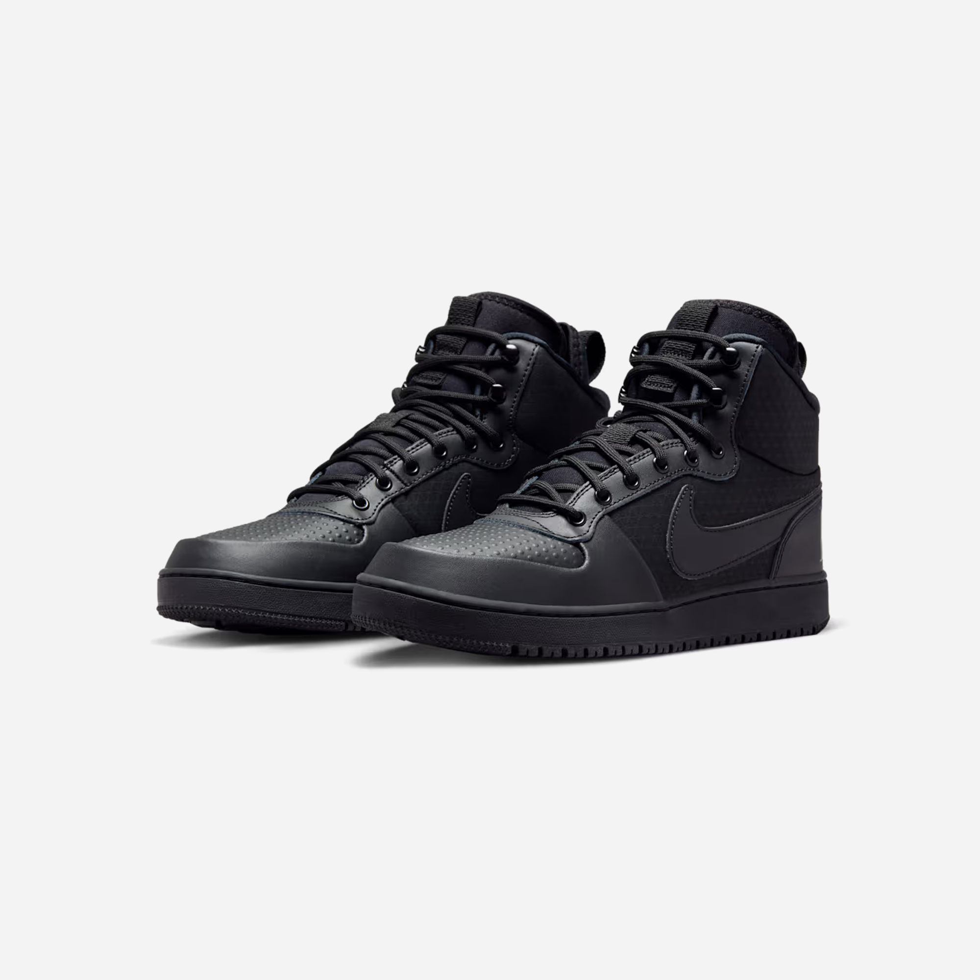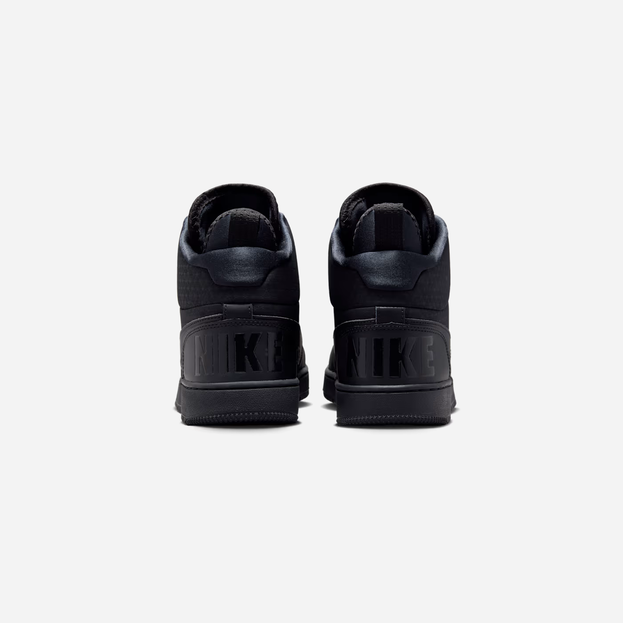 Nike Court Borough Mid Winter Triple Black combines classic basketball silhouette with cold weather protection. Premium black leather construction offers durability and style. Cushioned midsole ensures comfort for daily wear. Perfect for sneaker enthusiasts seeking versatile winter footwear with iconic Nike heritage and performance technology.