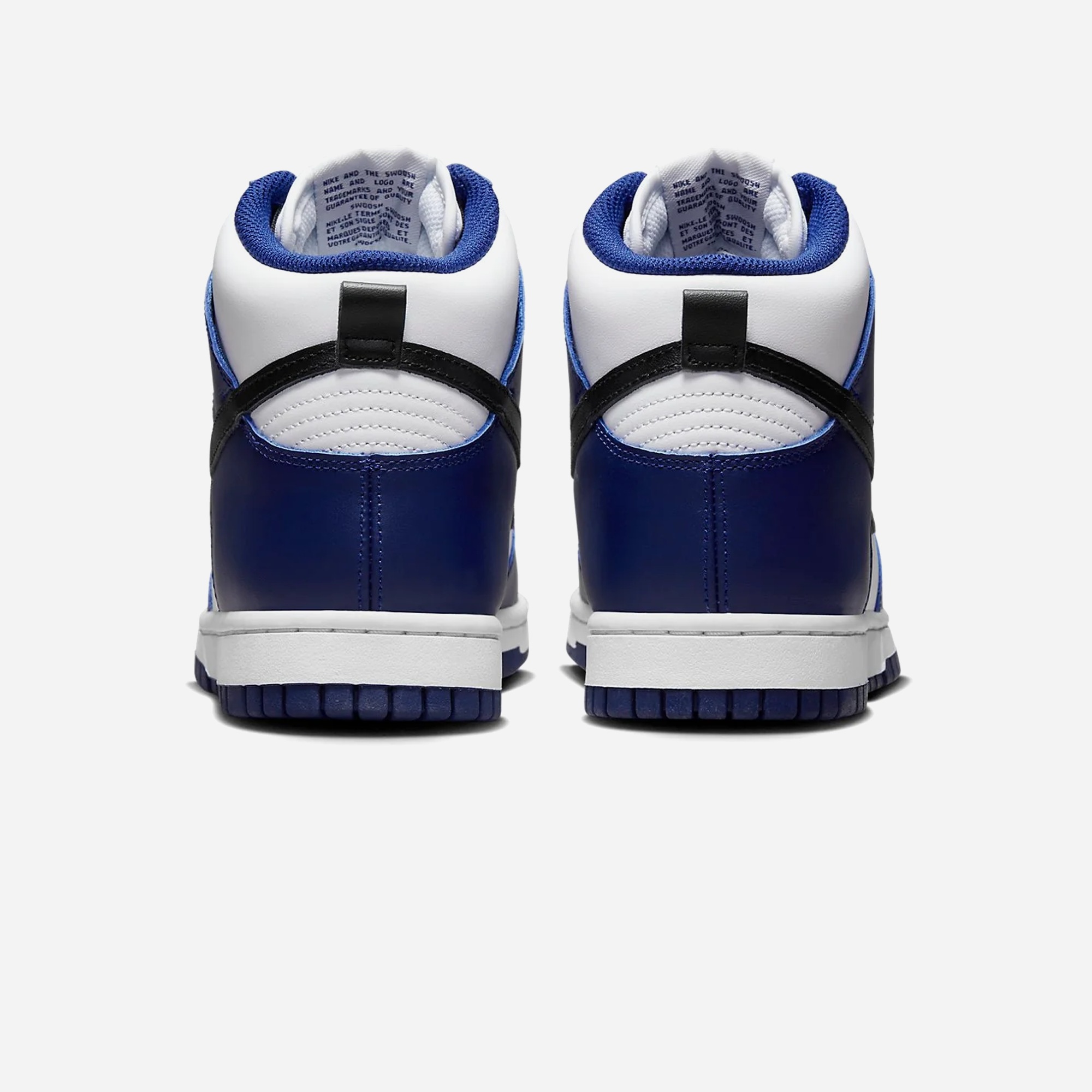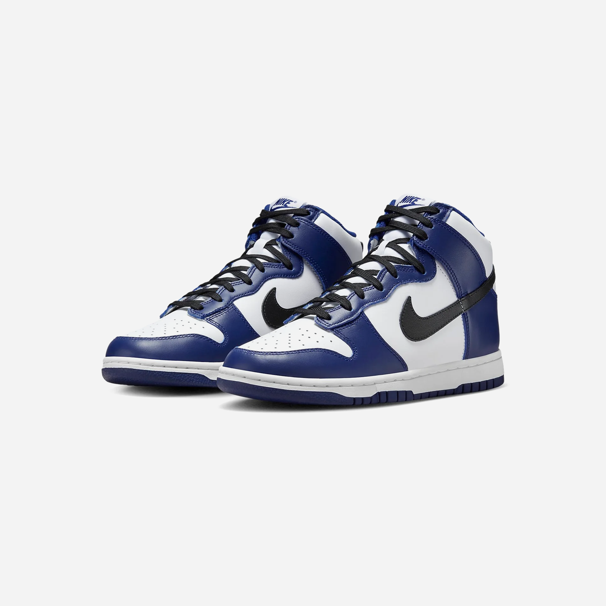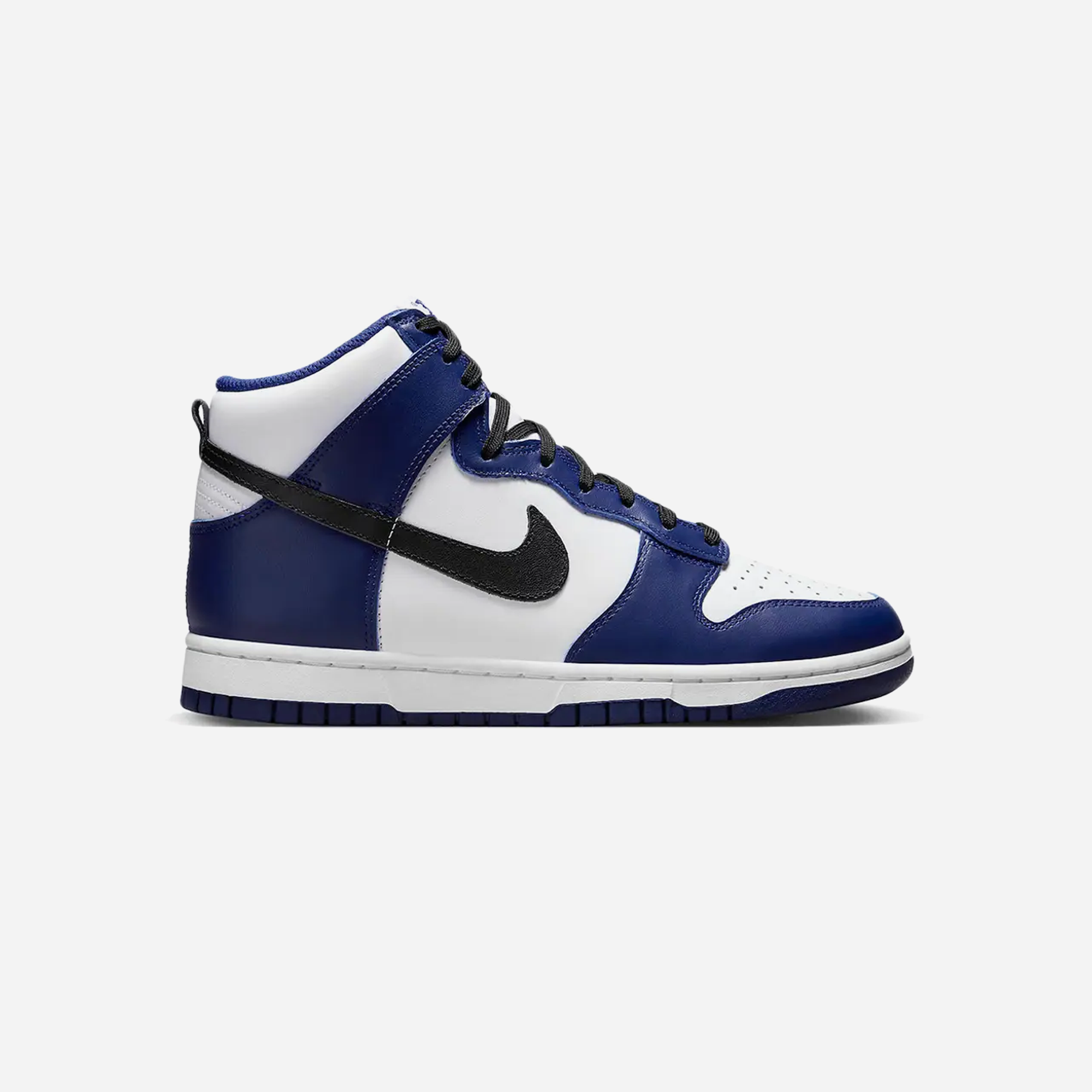 The Nike Dunk High 'Deep Royal Blue' is a women's sneaker that combines a white leather base with deep royal blue overlays, offering a striking contrast. Black accents on the Swoosh, laces, and heel pull tab enhance its visual appeal. The design maintains classic elements like the perforated toe box and a white midsole atop a deep royal blue rubber outsole.