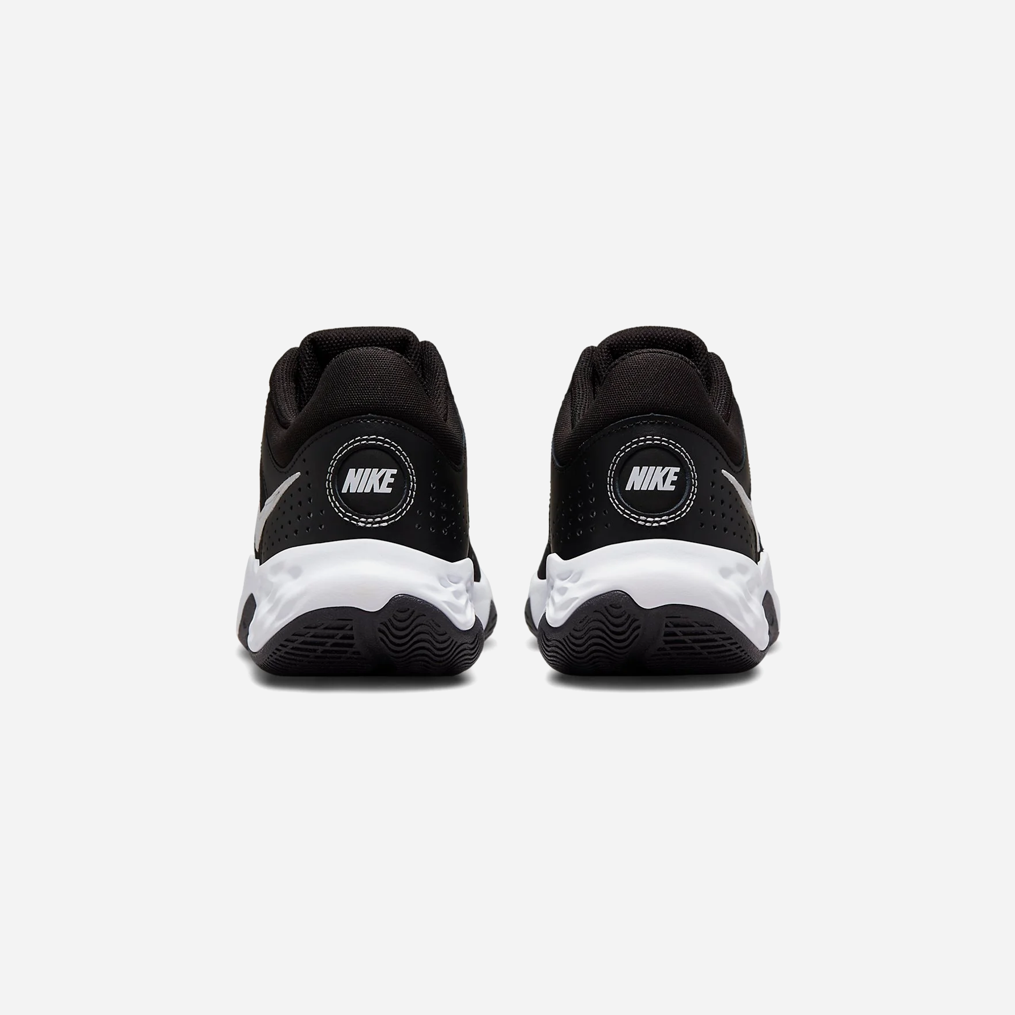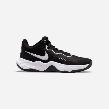 The Nike Fly By Mid 3 Black White dresses the mid-top hoops shoe in a simple two-tone color scheme. The black mesh upper is fortified with a combination of tonal no-sew skins and perforated leather overlays. Contrasting white branding elements include an embroidered Swoosh and a Nike wordmark stamped on the back heel. The sneaker sits atop a sculpted white foam midsole, supported by a black rubber outsole with flex grooves and a modified herringbone tread.
